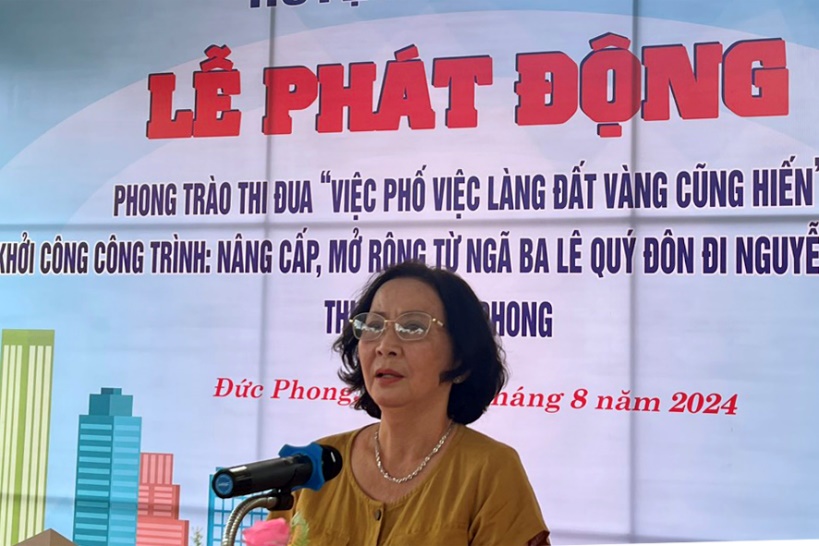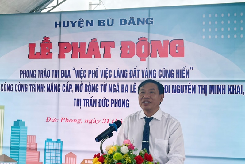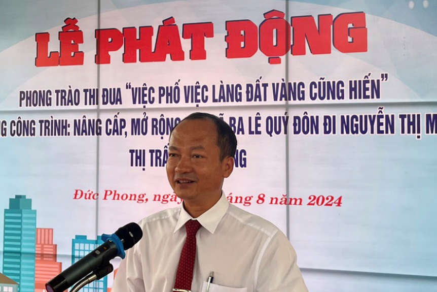 Ông Nguyễn Thế Hải Uỷ viên Ban thường vụ, Bí thư đảng uỷ thị trấn Đức Phong phát biểu hưởng ứng phong trào và kêu gọi nhân dân thị trấn tích cực hưởng ứng chung tay cùng Đảng bộ, chính quyền thị trấn tham gia hiến đất làm đương