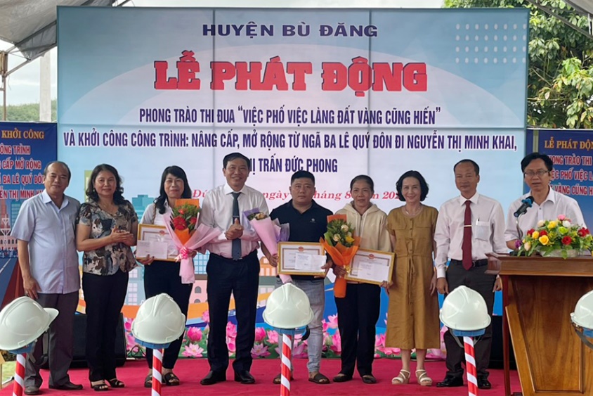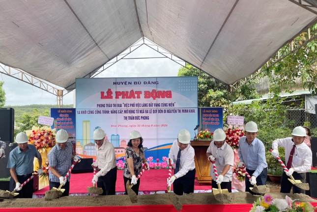 Lãnh đạo huyện Bù Đăng, thị trấn Đức Phong thực hiện nghi thức khởi công xây dựng công trình đường Lê Quý Đôn đi Nguyễn Thị Minh Khai