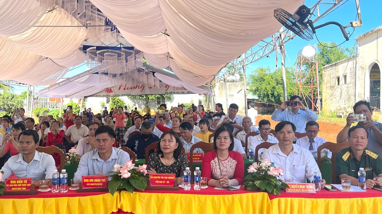 Lãnh đạo Huyện uỷ, UBND, UBMTTQVN huyện tặng hoa chúc mừng các bộ và nhân dân thôn Đak Xuyên.