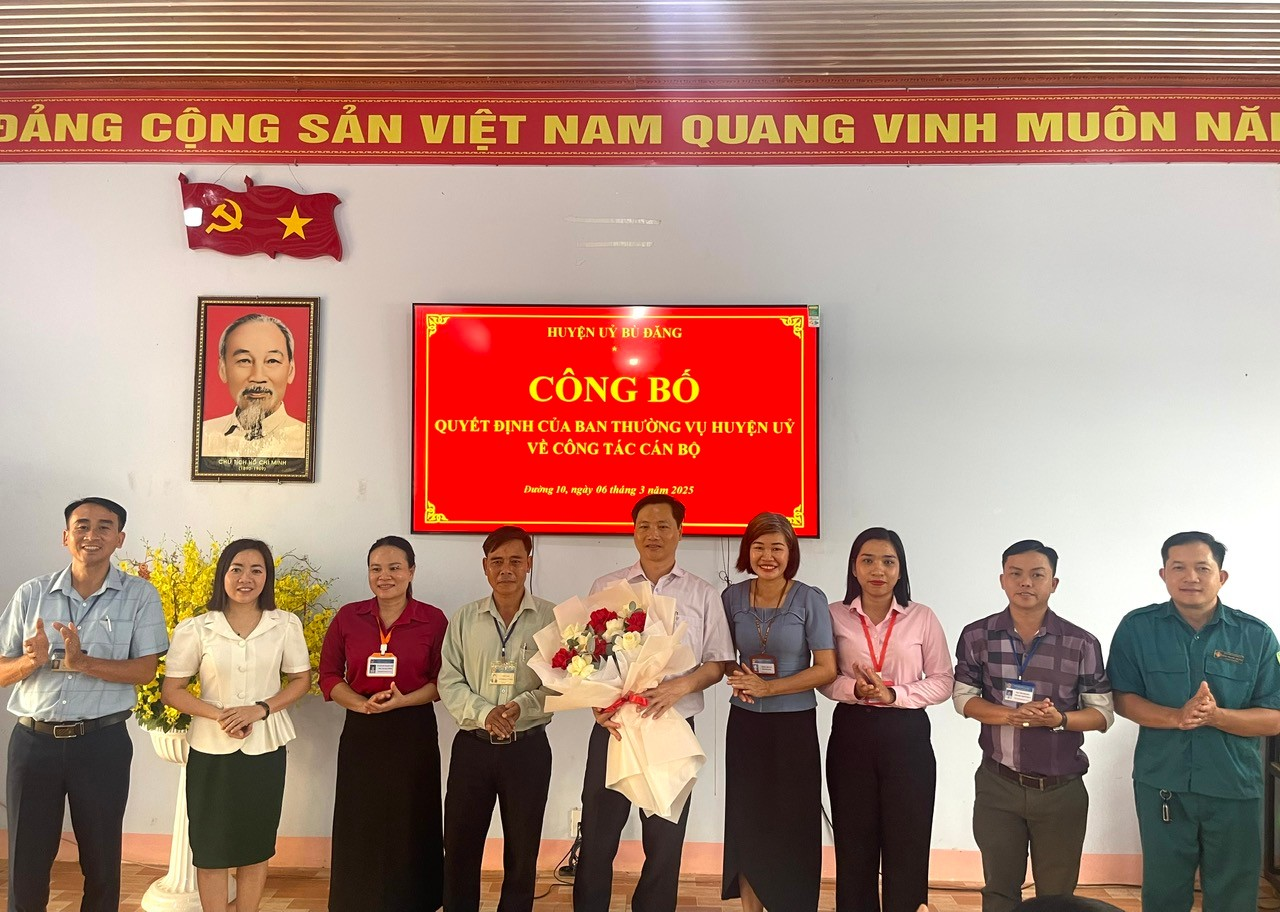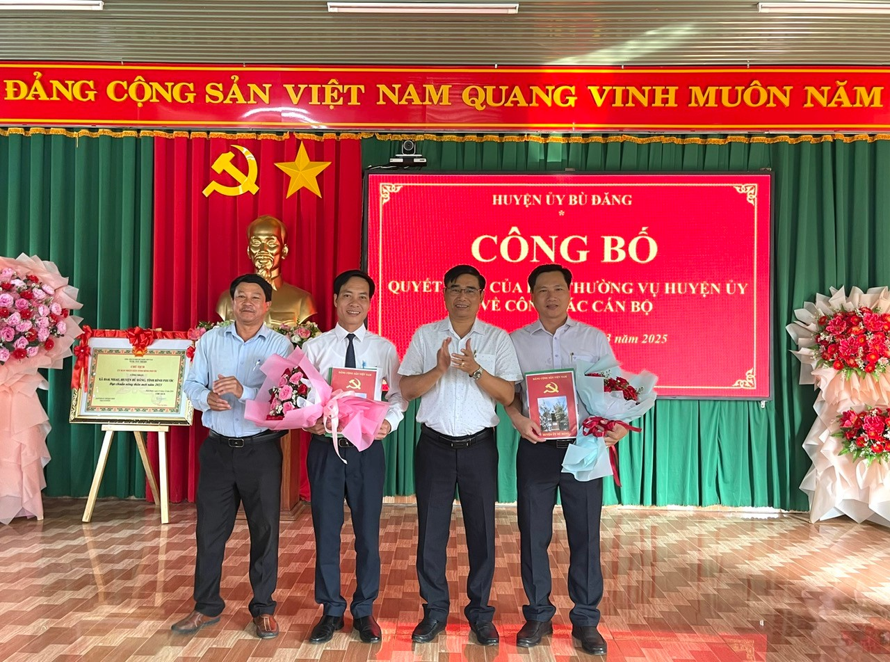 Tại buổi lễ, đồng chí Chánh Văn phòng Huyện ủy công bố các Quyết định của Ban Thường vụ Huyện ủy: điều động đồng chí Trần Duy Hiệp – UVBTV Đảng uỷ, Phó Chủ tịch UBND xã Đức Liễu, đến nhận công tác tại Đảng uỷ xã Đak Nhau; chỉ định tham gia Ban Chấp hành, Ban Thường vụ và giữ chức vụ Phó Bí thư Đảng uỷ xã Đak Nhau, nhiệm kỳ 2020 – 2025, kể từ ngày 10/3/2025. điều động đồng chí Nguyễn Mạnh Trường – Phó Bí thư Đảng uỷ, Chủ tịch UBND xã Đak Nhau, đến nhận công tác tại Đảng uỷ xã Đường 10; chỉ định tham gia Ban Chấp hành, Ban Thường vụ và giữ chức vụ Phó Bí thư Đảng uỷ xã Đường 10, nhiệm kỳ 2020 – 2025, kể từ ngày 10/3/2025.