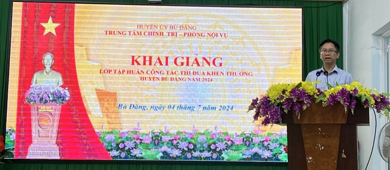 Chiều ngày 4-7, Phòng Nội vụ phối hợp Trung tâm Chính trị huyện Bù Đăng tổ chức Hội nghị tập huấn công tác thi đua, khen thưởng năm 2024 cho 155 đại biểu là đại diện lãnh đạo, chuyên viên, công chức, viên chức phụ trách công tác thi đua, khen thưởng của các cơ quan, đơn vị, địa phương trên địa bàn huyện.