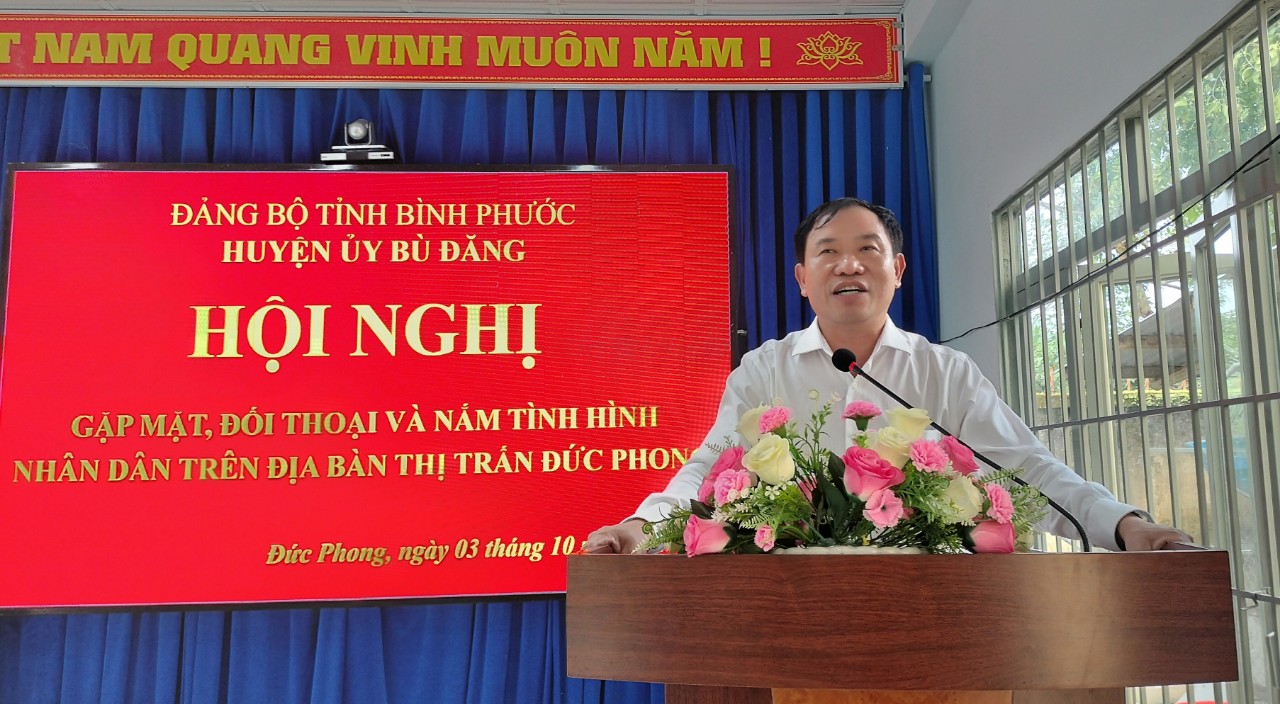 Sáng 3-10, Huyện Bù Đăng tổ chức hội nghị đối thoại trực tiếp giữa lãnh đạo huyện với Nhân dân thị trấn Đức Phong. TUV. Bí thư huyện ủy Vũ Lương chủ trì Hội nghị.
