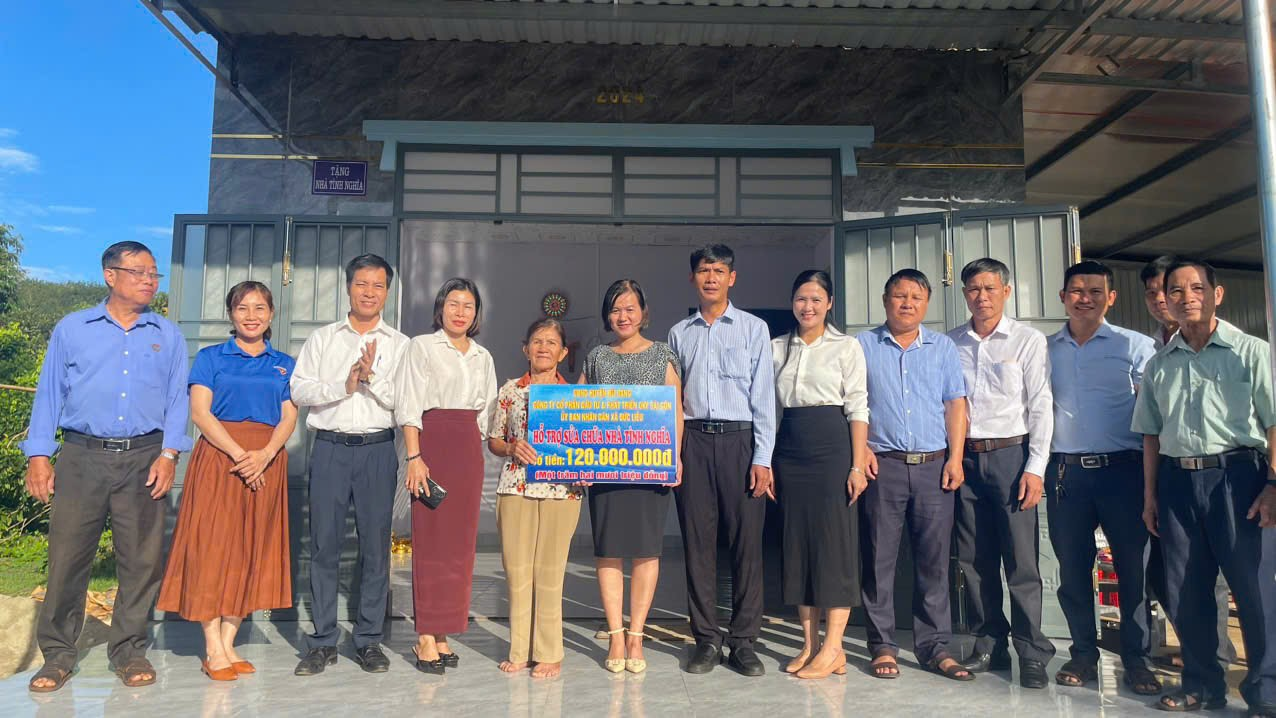 bà Nguyễn Thị Hồng Thắm – Trưởng phòng LĐTB&XH; lãnh Đảng uỷ, HĐND, UBND, UBMTTQVN xã Đức Liễu trao bảng tượng trưng hỗ trợ tiền xây nhà.