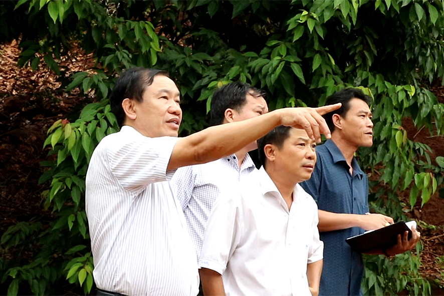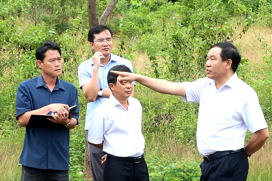 Chủ tịch UBND huyện Vũ Văn Mười cùng lãnh đạo các phòng chuyên môn khảo sát thực trạng, công tác quy hoạch, các hạng mục công trình tại Khu Bảo tồn Văn hóa dân tộc S’tiêng sóc Bom Bo