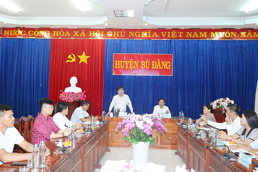 ông Vũ Văn Mười, Phó Bí thư huyện ủy, Chủ tịch UBND huyện Bù Đăng báo cáo sơ lược về tình hình phát triển kinh tế, văn hóa - xã hội, quốc phòng – an ninh trên địa bàn huyện