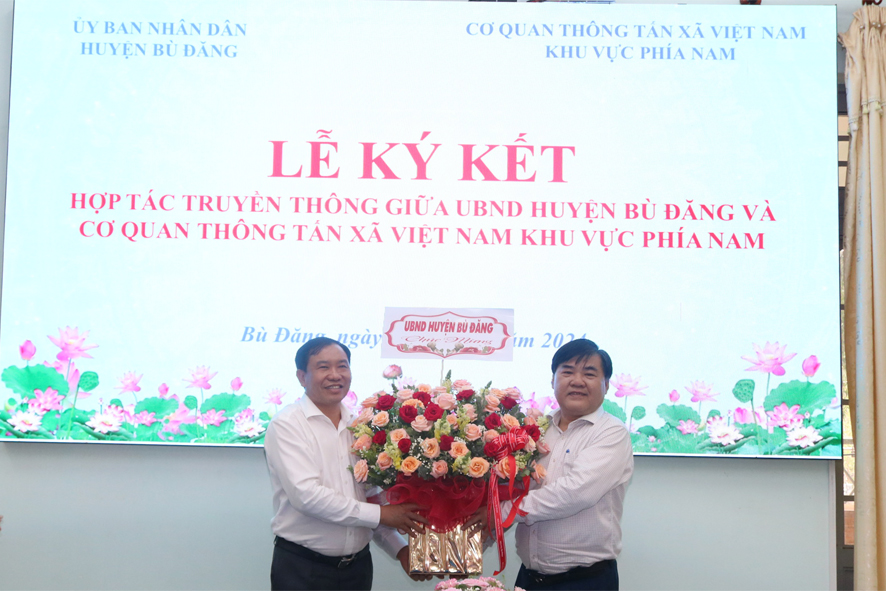 Lãnh đạo UBND huyện Bù Đăng tặng hoa chúc mừng cho lãnh đạo Cơ quan TTXVN Khu vực phía Nam và cơ quan TTXVN thường trú tại tỉnh Bình Phước