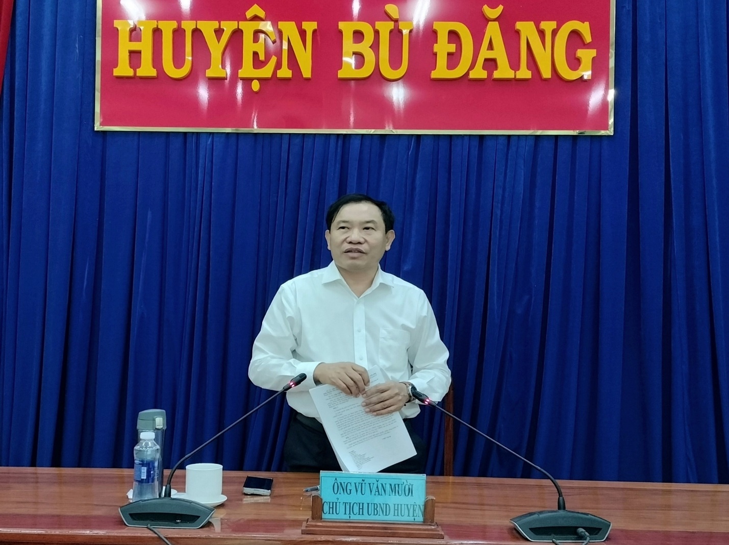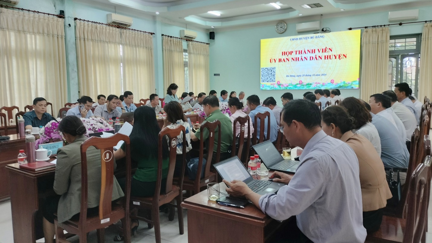 Chiều 29-10, Chủ tịch UBND huyện Bù Đăng Vũ Văn Mười chủ trì họp Thành viên UBND huyện nhằm đánh giá tình hình phát triển kinh tế, văn hóa, xã hội, QPAN 10 tháng đầu năm, xác định nhiệm vụ 02 tháng còn lại năm 2024. Dự cuộc họp có các Phó chủ tịch UBND huyện, thành viên UBND và lãnh đạo 16 xã, thị trấn trong toàn huyện.