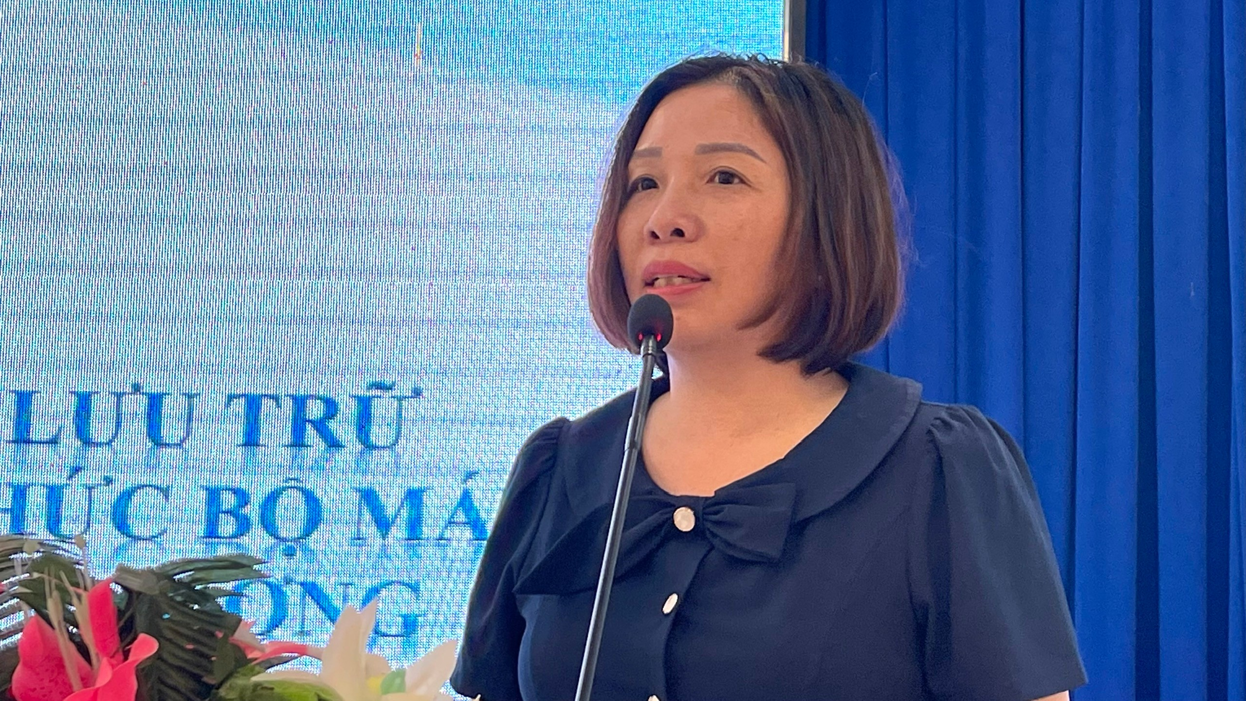 bà Lê Thị Lịch – Giám đốc Trung tâm Lưu trữ lịch sử tỉnh Bình Phước triển khai các văn bản về công tác quản lý văn thư, lưu trữ.