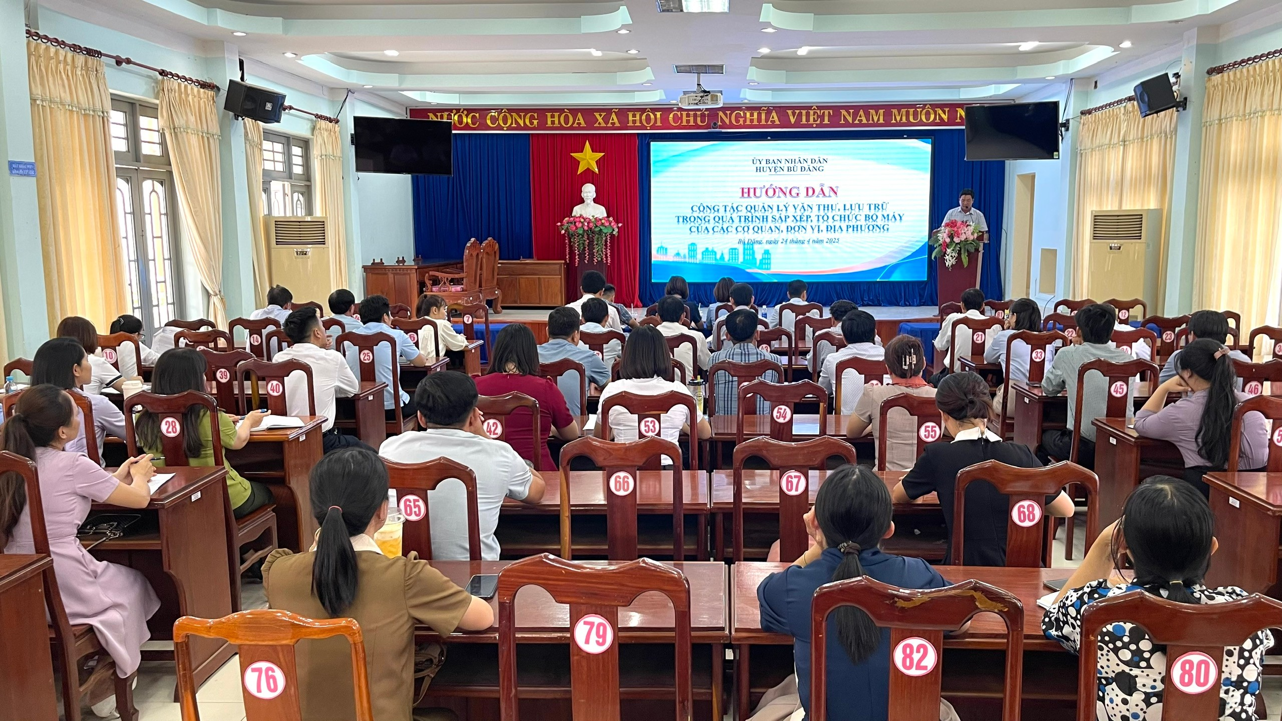 Chiều 24-4, Trung tâm Lưu trữ lịch sử tỉnh Bình Phước phối hợp với UBND huyện Bù Đăng tổ chức hướng dẫn, hỗ trợ quản lý công tác văn thư, lưu trữ trong quá trình sắp xếp tổ chức bộ máy của các cơ quan, đơn vị địa phương.