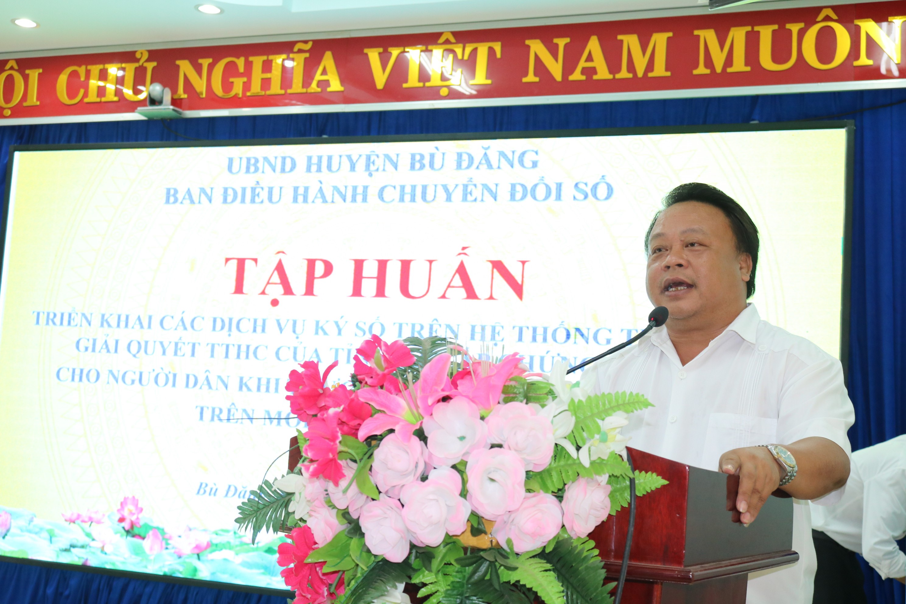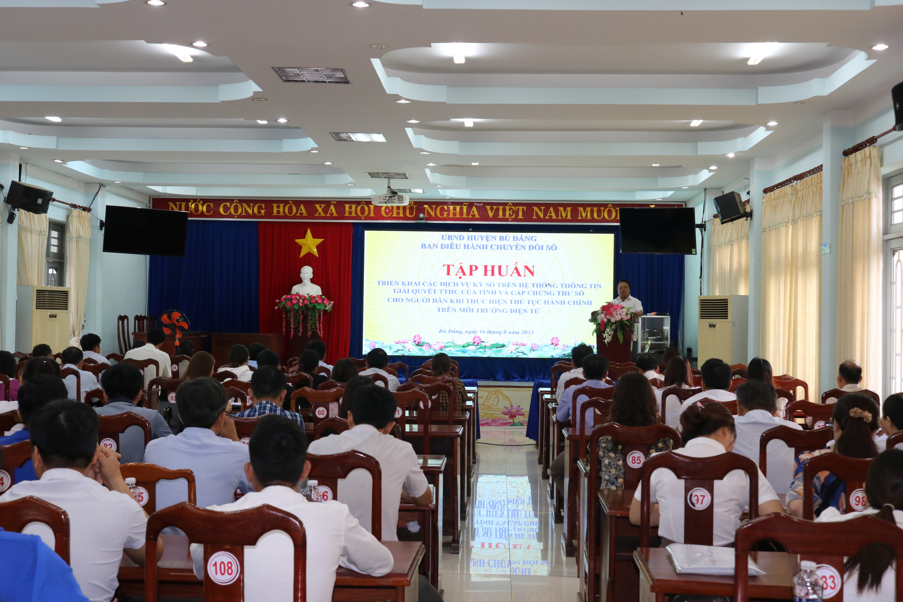 Về dự buổi tập huấn đại diện lãnh đạo UBND huyện và các phòng ban chuyên môn, hội đoàn thể có Bà Lương Thị Mỹ Duyên huyện ủy viên – Chủ tịch liên đoàn lao động huyện, bà Nguyễn Thị Hà phó chánh văn phòng UBND – HĐND huyện, bà Trần Thị Hoài phó Bí thư huyện đoàn, đại diện cho cơ quan thường trực và đơn vị phối hợp tổ chức thực hiện có ông Vũ Đức Hoàng Trường phòng VHTT – Phó trưởng ban thường trực Ban điều hành chuyển đổi số huyện, ông Võ Đức Trung giám đốc VNPT chi nhánh huyện Bù Đăng.