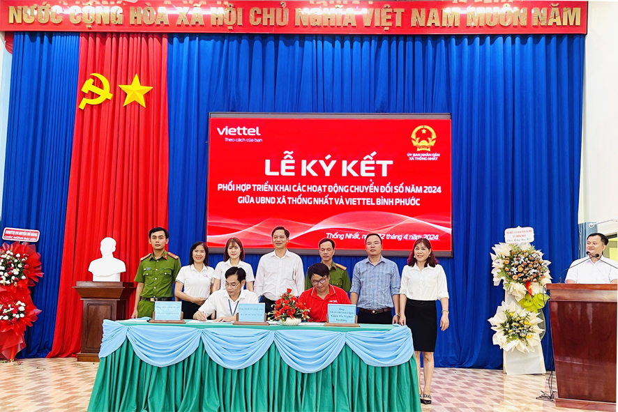 Đại diện lãnh đạo UBND xã Thống Nhất ký kết phối hợp với lãnh đạo Viettel Bù Đăng về triển khai các hoạt động chuyển đổi số