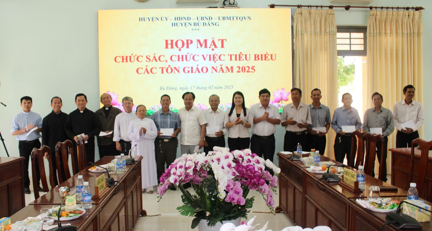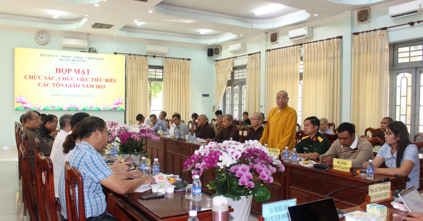 Sáng 17-2, Huyện ủy, HĐND, UBND, Ủy ban MTTQ Việt Nam huyện Bù Đăng tổ chức họp mặt chức sắc các tôn giáo tiêu biểu trên địa bàn huyện. Ông Lê Thanh Hải, Uỷ viên Ban thường vụ, Trưởng ban Dân vận; Ông Nguyễn Tuấn Anh, Ủy viên ban thường vụ, Chủ tịch UBMTTQVN huyện, bà Thị Diệu Hiền, Phó Chủ tịch UBND huyện Bù Đăng dự và chủ trì buổi họp mặt.
