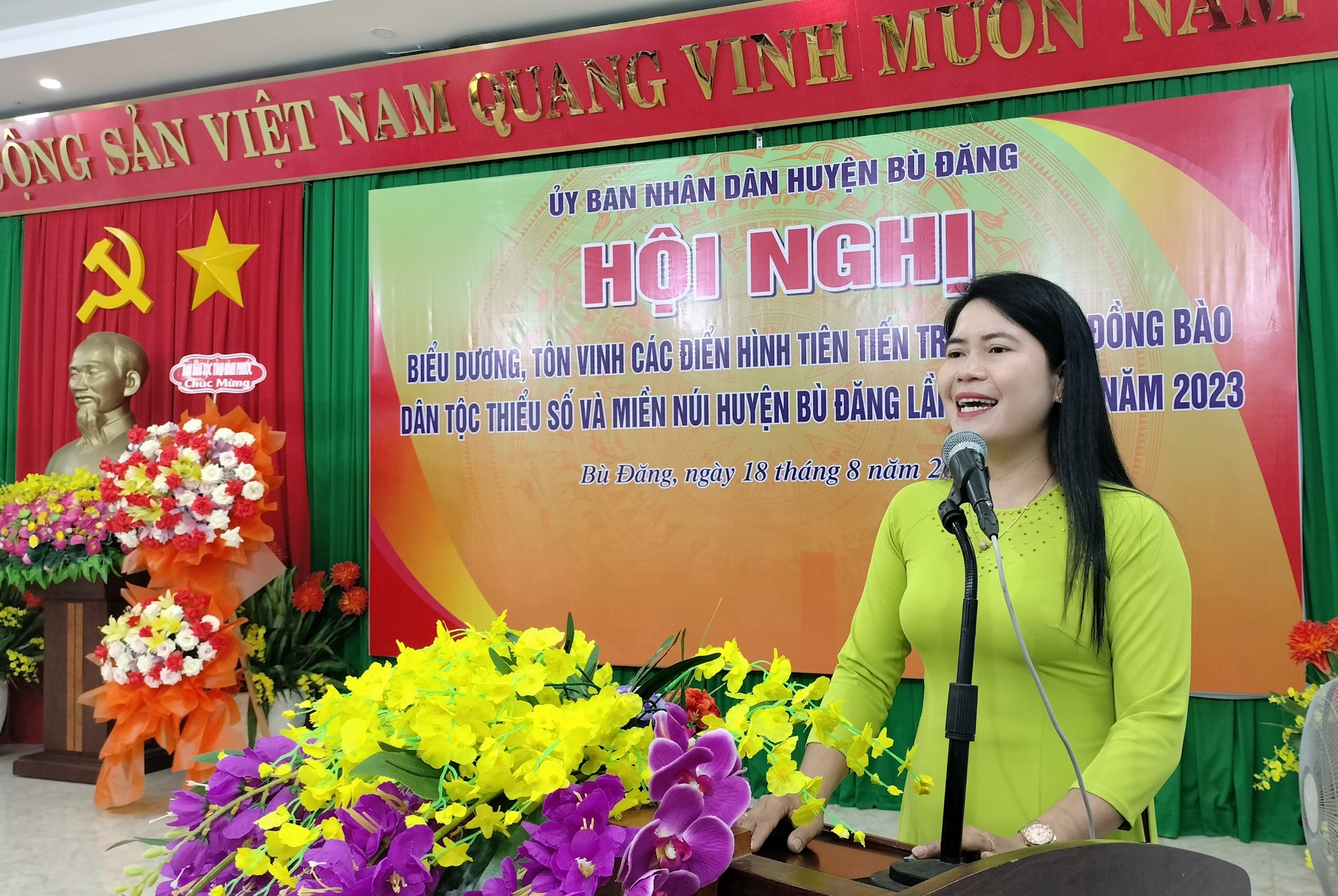 Sáng nay 18-8, UBND huyện Bù Đăng tổ chức hội nghị biểu dương, tôn vinh 200 điển hình tiên tiên là Người có uy tín, các vị già làng, trưởng thôn ấp, cán bộ cốt cán, nhân sĩ trí thức, doanh nhân, người sản xuất kinh doanh giỏi, học sinh, sinh viên, thanh niên tiêu biểu người DTTS… trong các lĩnh vực kinh tế, văn hóa, xã hội, quốc phòng và an ninh trên địa bàn huyện. Dự hội nghị có Ông Điểu Nen – Phó trưởng Ban dân tộc, phụ trách Ban dân tộc tỉnh Bình Phước tỉnh Bình Phước. Phó chủ tịch UBND huyện Bù Đăng Thị Diệu Hiền chủ trì Hội nghị.