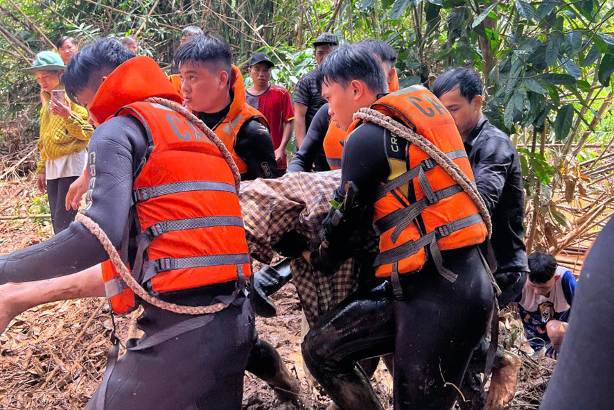 Lực lượng tìm kiếm cứu hộ, cứu nạn công an tỉnh và ba xã trục với thi thể chị T lên bờ để bàn giao cho gia đình lo hậu sự