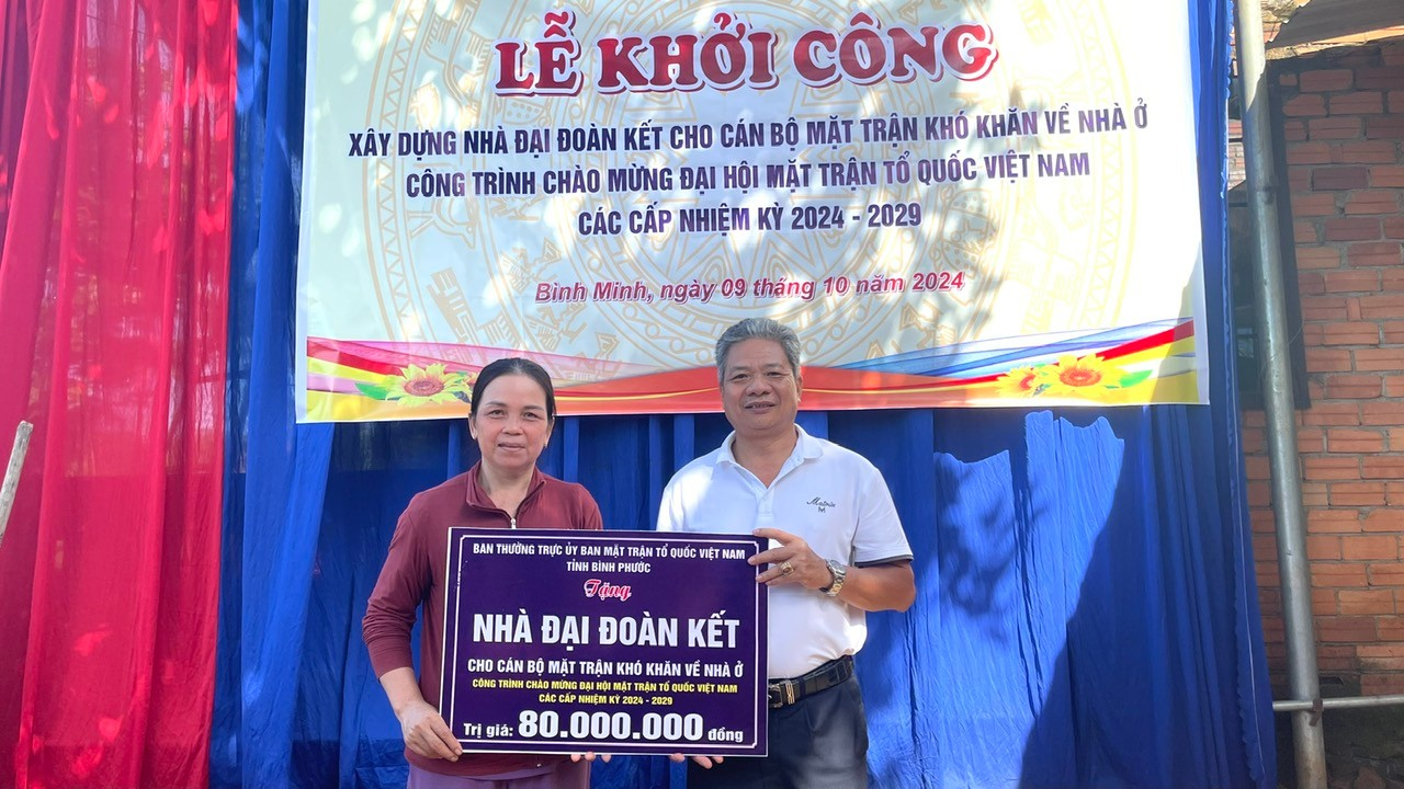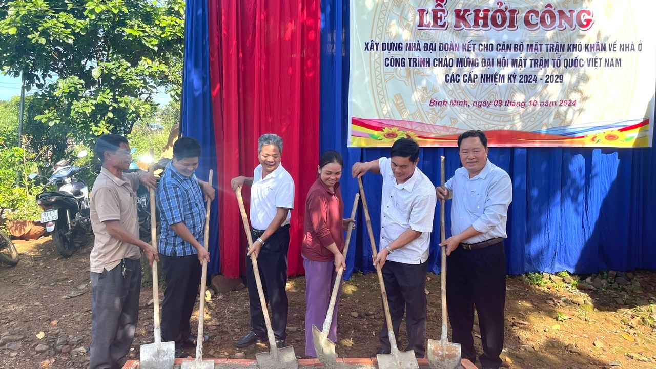 Sáng 9-10, Ban Thường trực Ủy ban MTTQ Việt Nam tỉnh phối hợp với Ủy ban MTTQ Việt Nam huyện Bù Đăng, xã Bình Minh tổ chức khởi công xây dựng nhà đại đoàn kết cho hộ bà Dương Thị Thủy ở thôn 5, là Trưởng ban công tác mặt trận thôn, khó khăn về nhà ở.