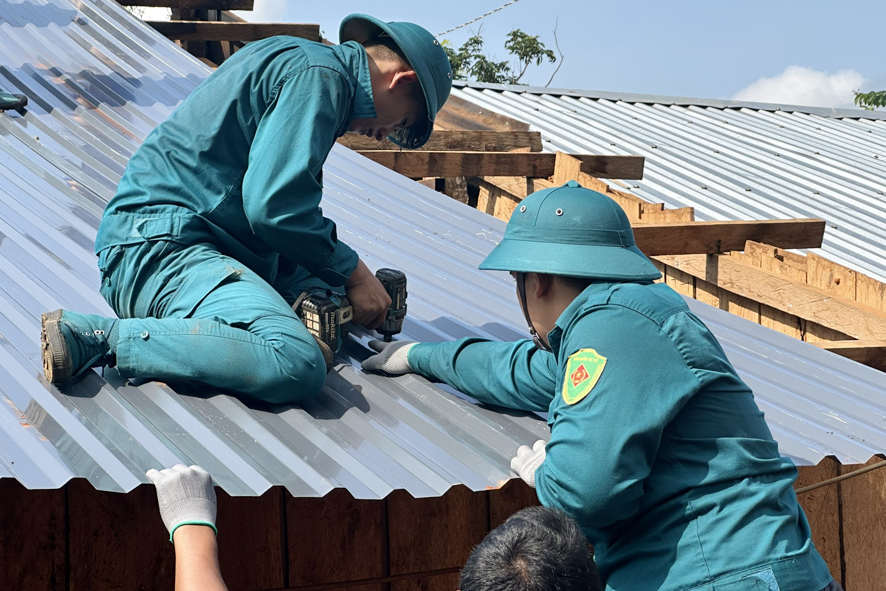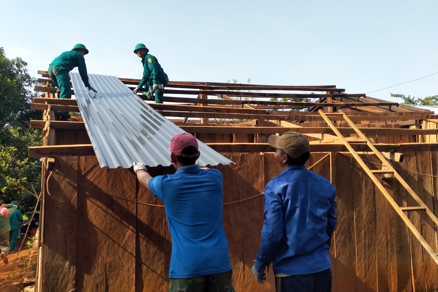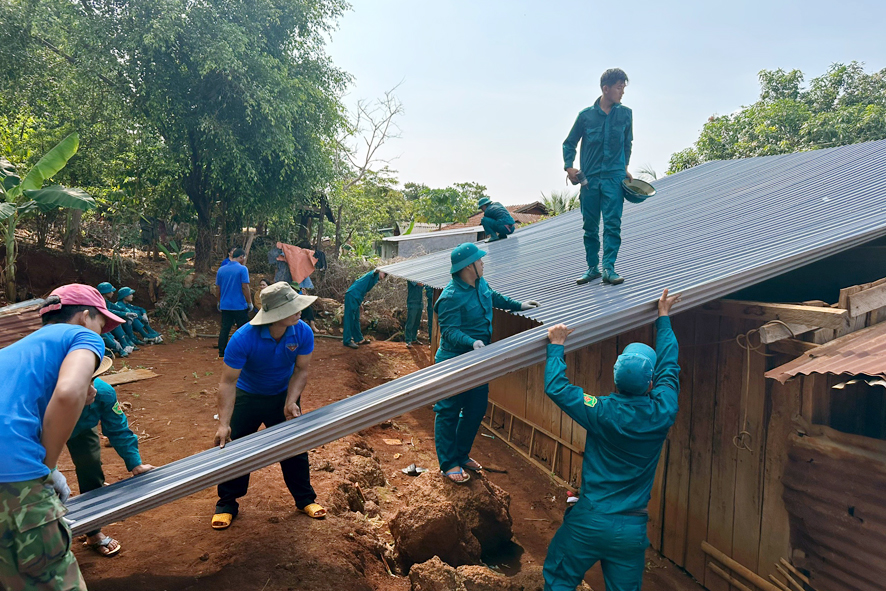 30 đoàn viên thanh niên cùng lực lượng dân quân hỗ trợ thay mới tol, lợp lại mái nhà cho gia đình đoàn viên Điểu Công Danh