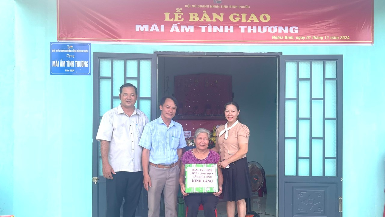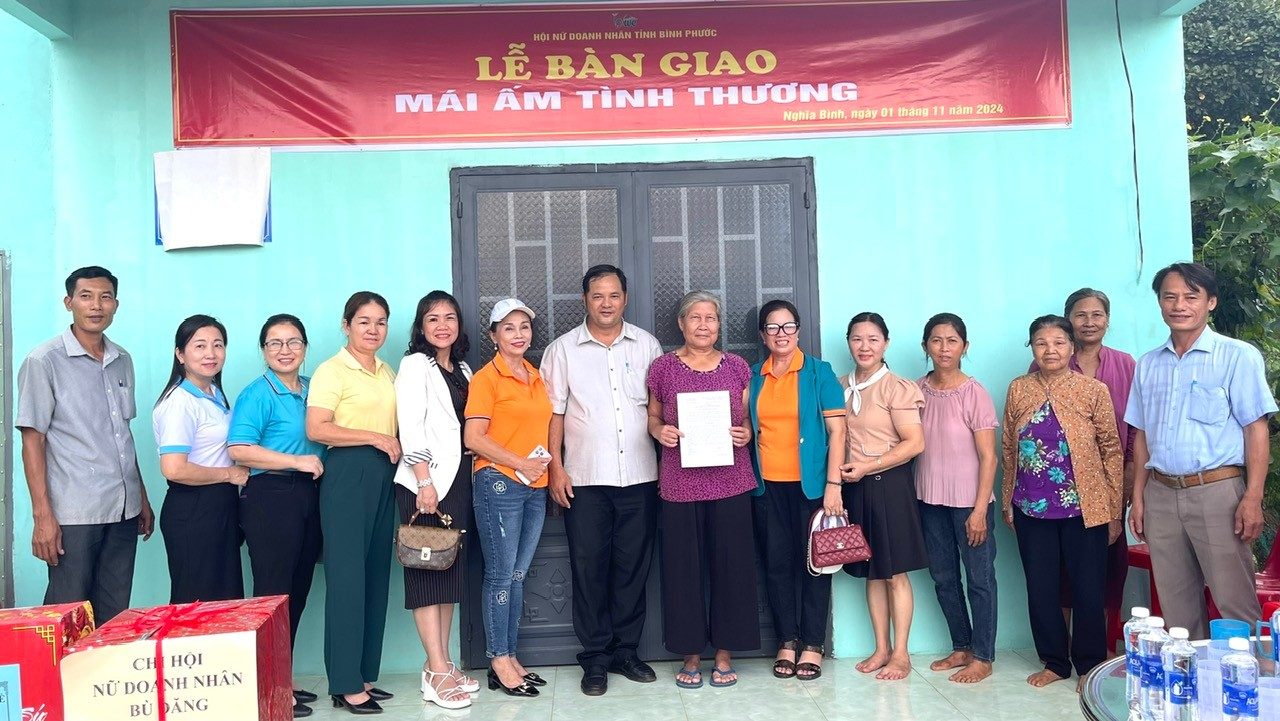 Chiều 01-11, Hội nữ Doanh nhân tỉnh Bình Phước phối hợp với UBND xã Nghĩa Bình đã trao tặng mái ấm tình thương cho bà Hồ Sy Múi, thôn Bình Hoà, xã Nghĩa Bình, Huyện Bù Đăng. Dự lễ trao tặng nhà có các đồng chí Uỷ viên Ban chấp hành Hội nữ Doanh nhân tỉnh Bình Phước; lãnh đạo Hội liên hiệp phụ nữ huyện; Chi hội nữ Doanh nhân huyện Bù Đăng, huyện Bù Đốp, thị xã Phước Long; lãnh đạo UBND, UBMTTQVN xã; đại diện các hội, đoàn thể xã.