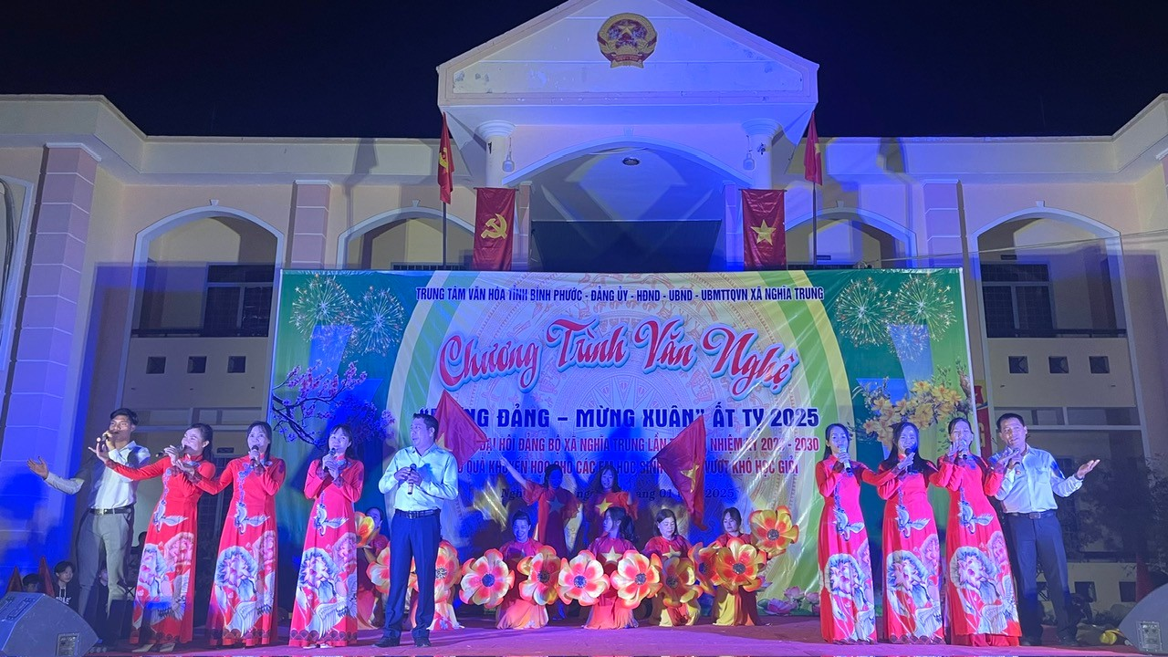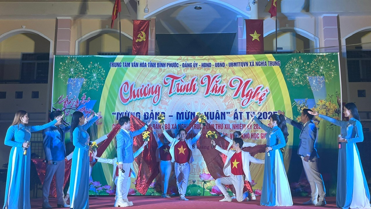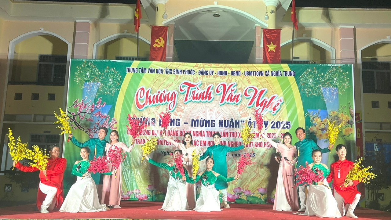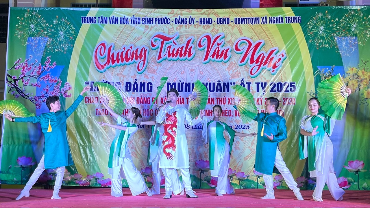 Thiết thực Chào mừng kỷ niệm 95 năm Ngày thành Đảng cộng sản Việt Nam (03/2/1930 - 03/2/2025), Chào mừng Đại hội Đảng bộ xã Nghĩa Trung Lần thứ XII, nhiệm kỳ 2025 - 2030 và tiến tới chào mừng Đại hội Đảng các cấp. Tối ngày 08-01, Đảng uỷ, HĐND, UBND, UBMTTQVN xã Nghĩa Trung phối hợp với Trung tâm Văn hoá tỉnh Bình Phước tổ chức Chương trình văn nghệ “Mừng Đảng - Mừng Xuân” Ất Tỵ 2025.