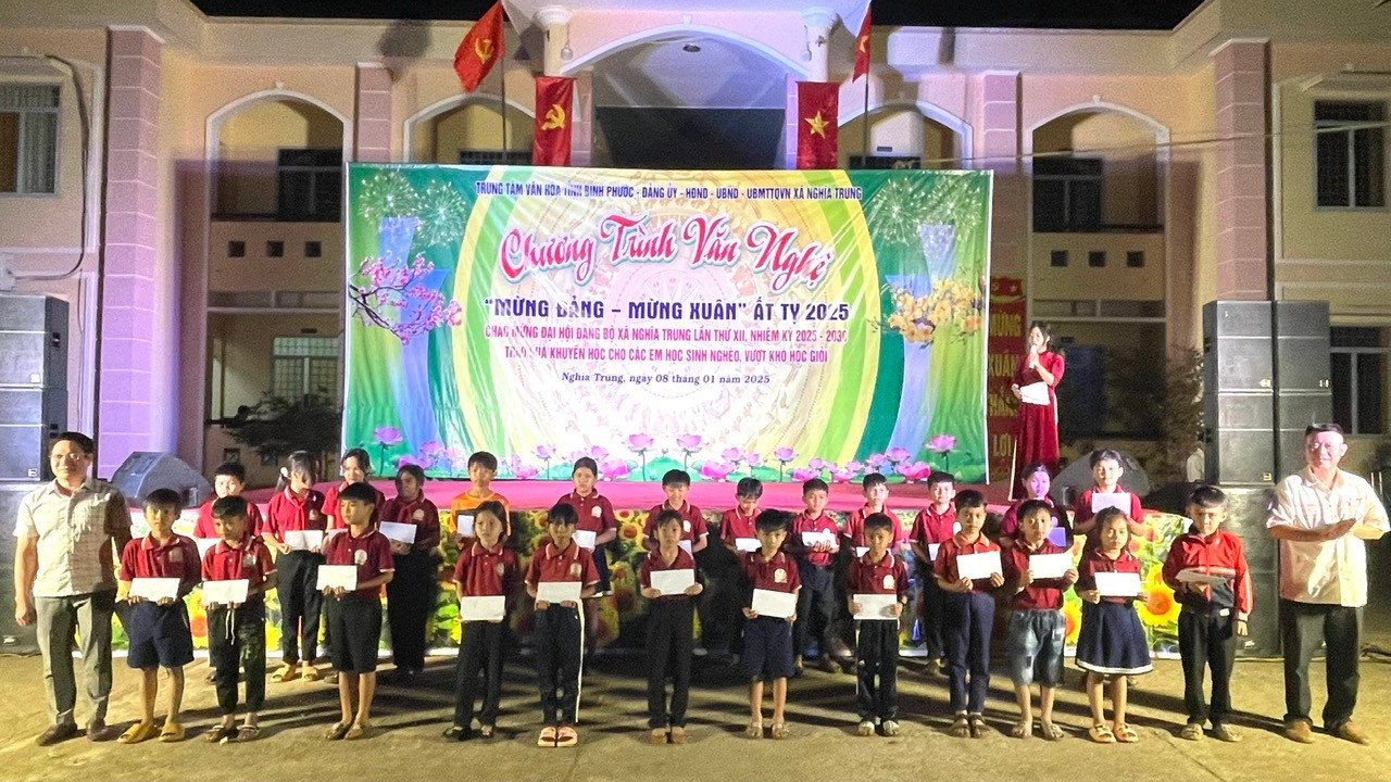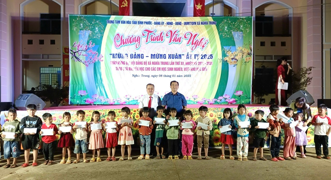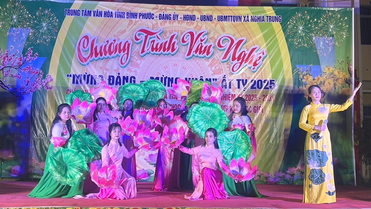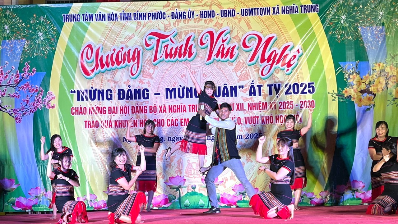 Thiết thực Chào mừng kỷ niệm 95 năm Ngày thành Đảng cộng sản Việt Nam (03/2/1930 - 03/2/2025), Chào mừng Đại hội Đảng bộ xã Nghĩa Trung Lần thứ XII, nhiệm kỳ 2025 - 2030 và tiến tới chào mừng Đại hội Đảng các cấp. Tối ngày 08-01, Đảng uỷ, HĐND, UBND, UBMTTQVN xã Nghĩa Trung phối hợp với Trung tâm Văn hoá tỉnh Bình Phước tổ chức Chương trình văn nghệ “Mừng Đảng - Mừng Xuân” Ất Tỵ 2025.