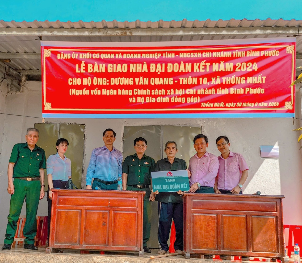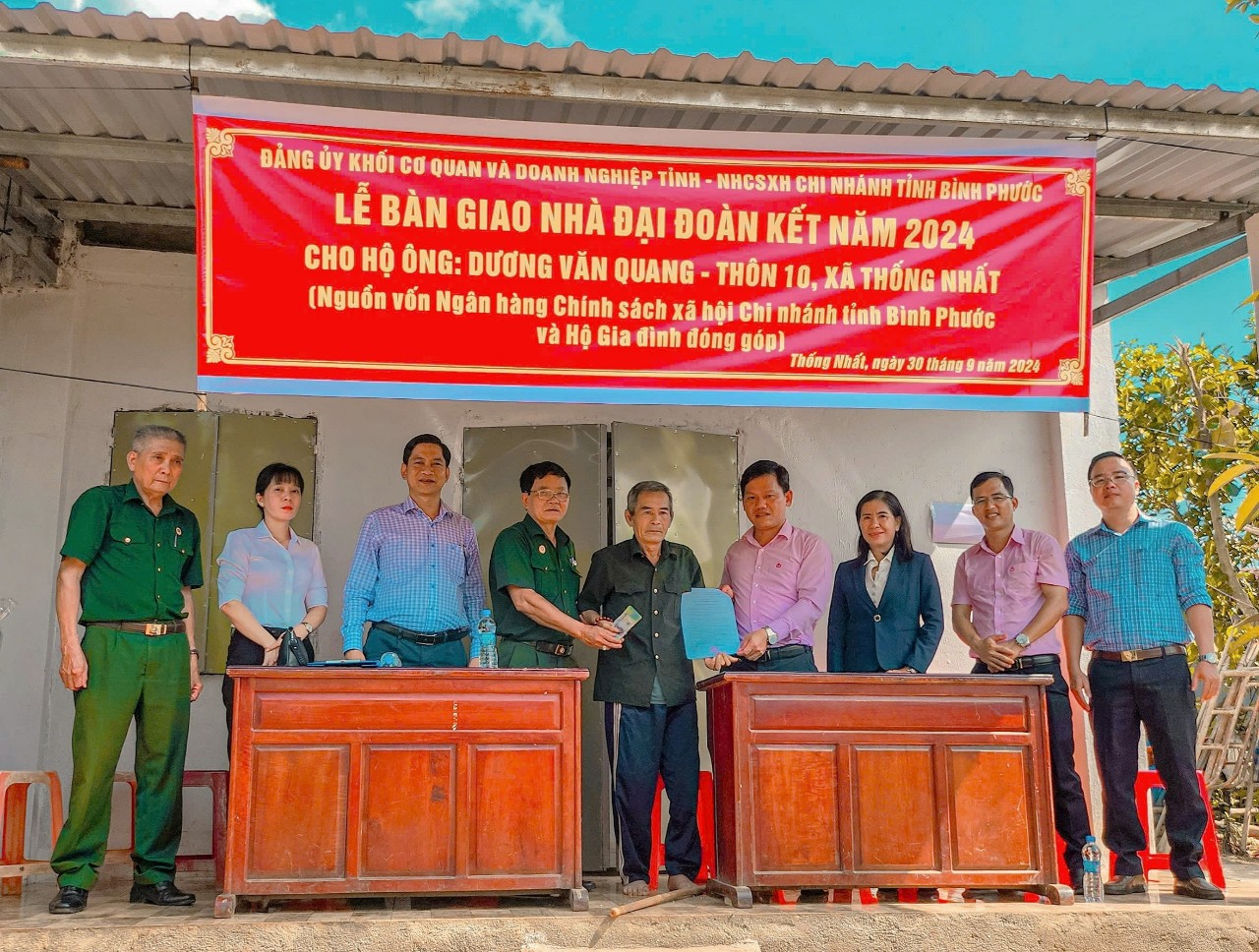 Ngày 30-9, Đảng ủy khối cơ quan doanh nghiệp tỉnh phối hợp Ngân hàng Chính sách xã hội Chi nhánh tỉnh Bình Phước, huyện Bù Đăng và Chính quyền địa phương tổ chức bàn giao nhà Đại Đoàn Kết cho hộ ông Dương Văn Quang – Thôn 10 xã Thống Nhất.