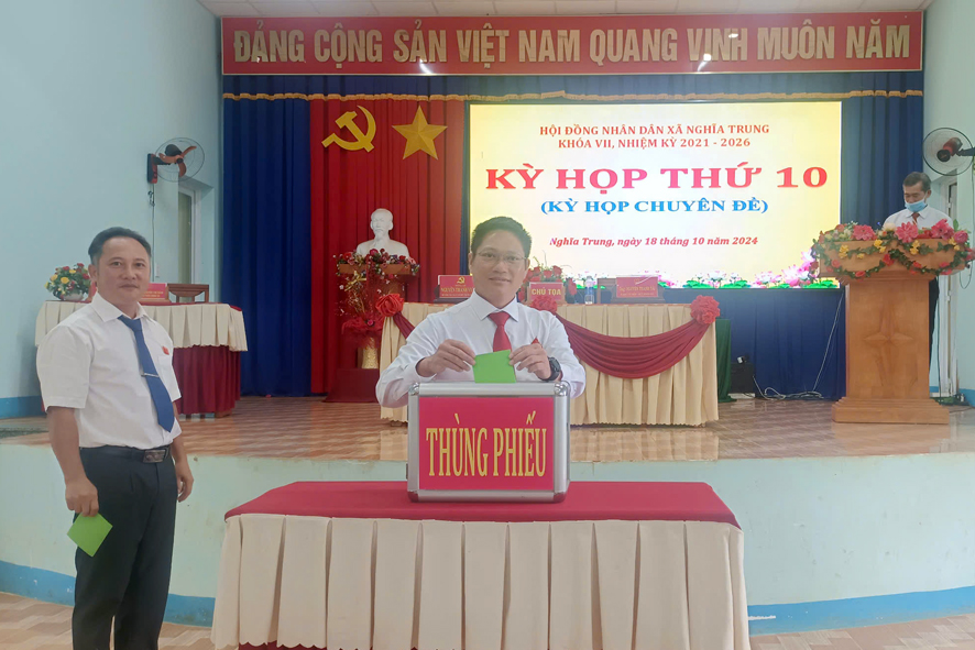 Tại kỳ họp, TT HĐNĐ xã đã thông qua Tờ trình của UBND xã về việc miễn nhiệm chức vụ Phó chủ tịch UBND xã Nghĩa Trung Khoá VII, nhiệm kỳ 2021 -2026 đối với ông Phan Tuấn Kiệt lý do chuyển công tác, đồng thời bầu bổ sung chức vụ Phó chủ tịch UBND xã Khoá VII, nhiệm kỳ 2021 -2026 đối với ông Phan Minh Phương uỷ viên Ban chấp hành Đảng uỷ. Kết quả đồng chí Phan Minh Phương, Ủy viên Ban Chấp hành Đảng uỷ được tín nhiệm giữ chức Phó Chủ tịch UBND xã, nhiệm kỳ 2021-2026 với tỷ lệ phiếu bầu đạt 100%.