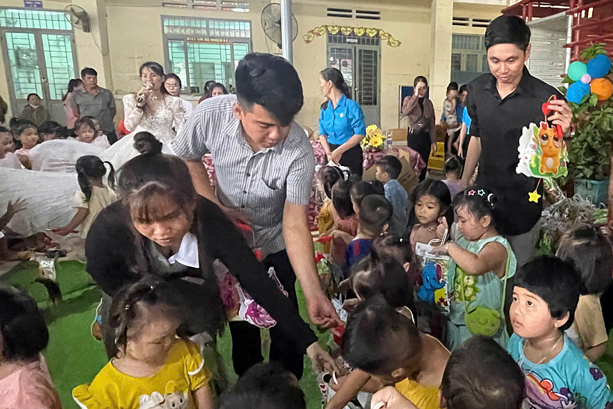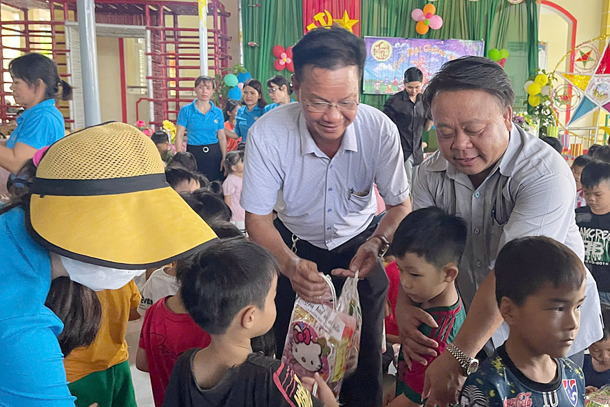 Đại diện nhóm Doanh nghiệp trẻ Bình Dương, Tây Ninh và lãnh đạo xã Đăng Hà, phòng VHTT huyện trao những phần quà trung chu cho các cháu học sinh trường Mầm non Đăng Hà