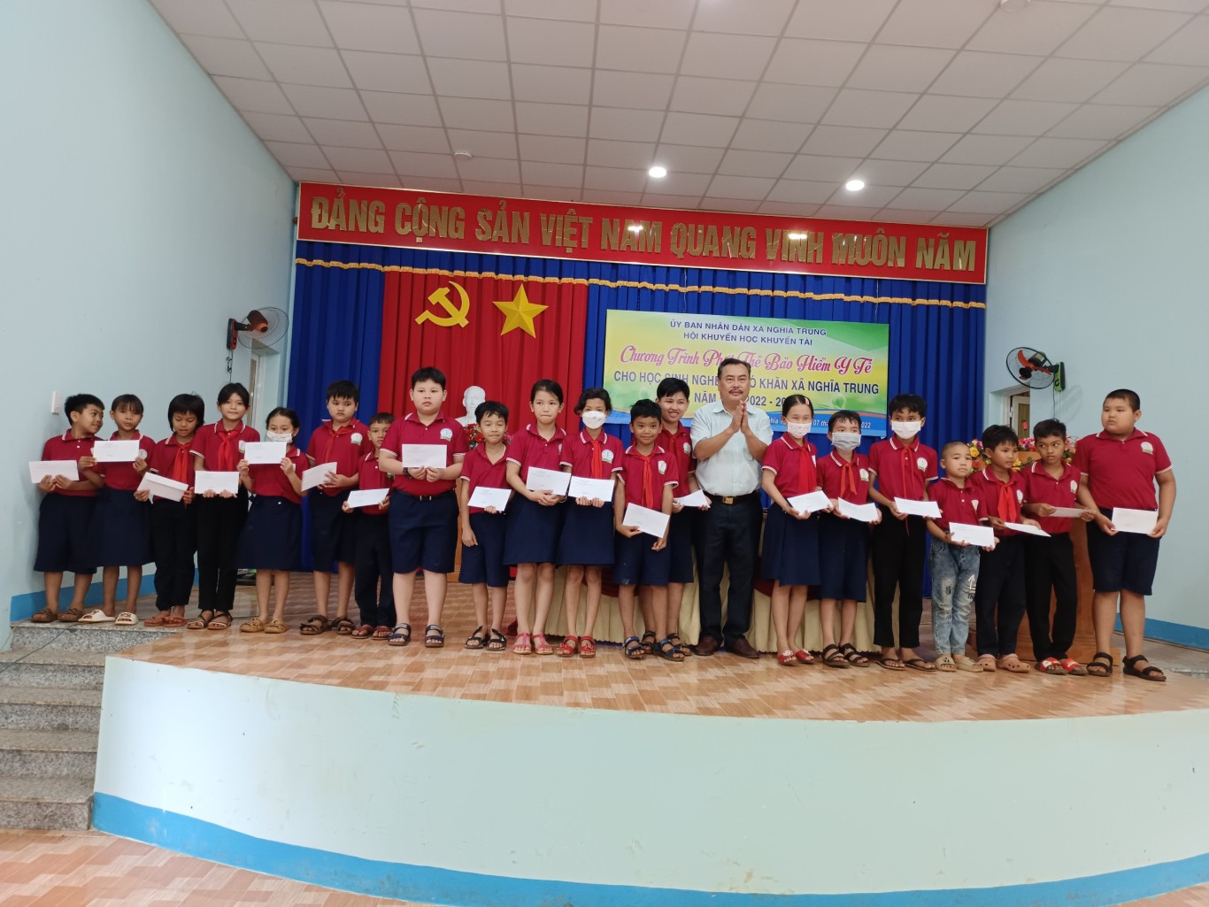 Chiều ngày 7/11, tại hội trường UBND xã, Hội khuyến học - khuyến tài xã Nghĩa Trung phối hợp Công ty Bất động sản Bình Minh - Bình Phước, Nha khoa Thuận Thiên Thôn 3 Nghĩa Trung và anh Phạm Trung Thôn 3 Nghĩa Trung tổ chức trao tặng 140 thẻ Bảo Hiểm Y Tế cho các em học sinh có hoàn cảnh khó khăn trên địa bàn xã.