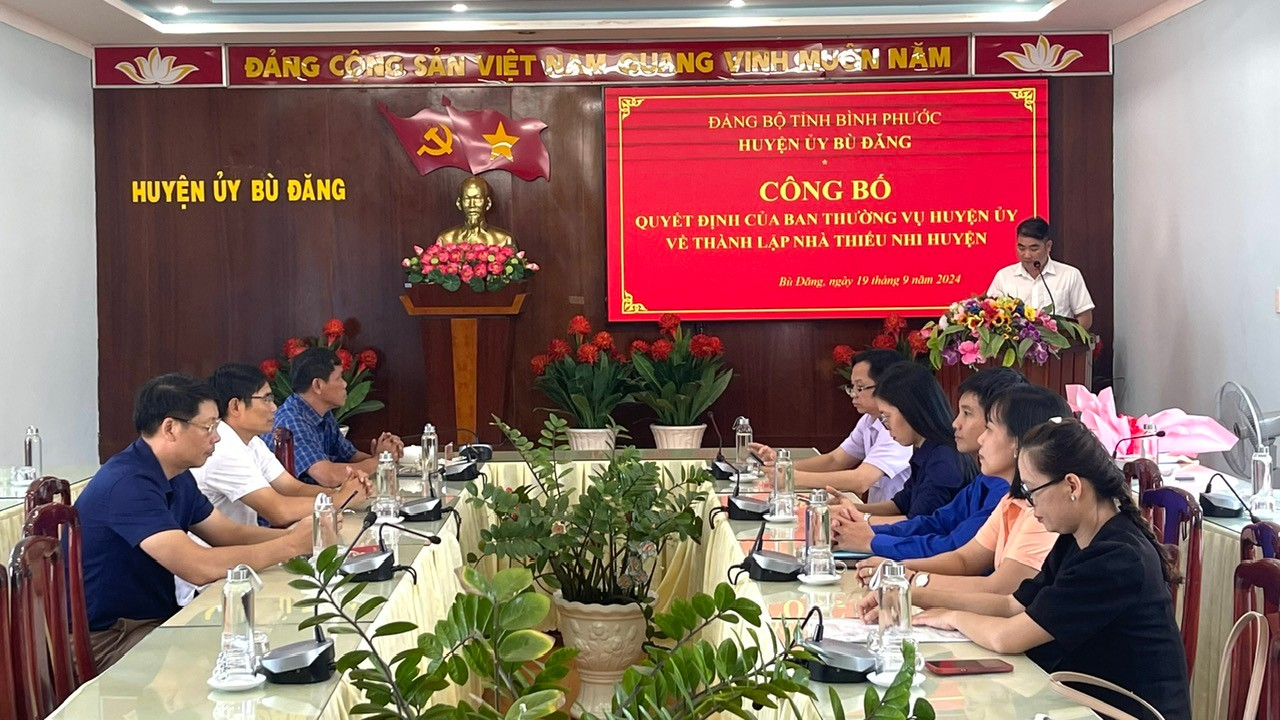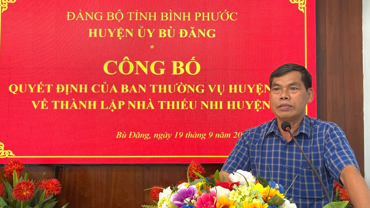 Tại buổi lễ, đồng chí Vũ Thế Vinh – UVBTV, Chánh văn phòng Huyện uỷ công bố Quyết định của Ban Thường vụ Huyện uỷ, về việc thành lập Nhà Thiếu nhi huyện Bù Đăng trên cơ sở chia tách, sắp xếp lại bộ máy phòng Văn hoá và Thông tin. Theo đó, Nhà Thiếu nhi huyện là đơn vị sự nghiệp có tư cách pháp nhân, con dấu và tài khoản riêng tại Kho Bạc nhà nước do Huyện Đoàn quản lý.