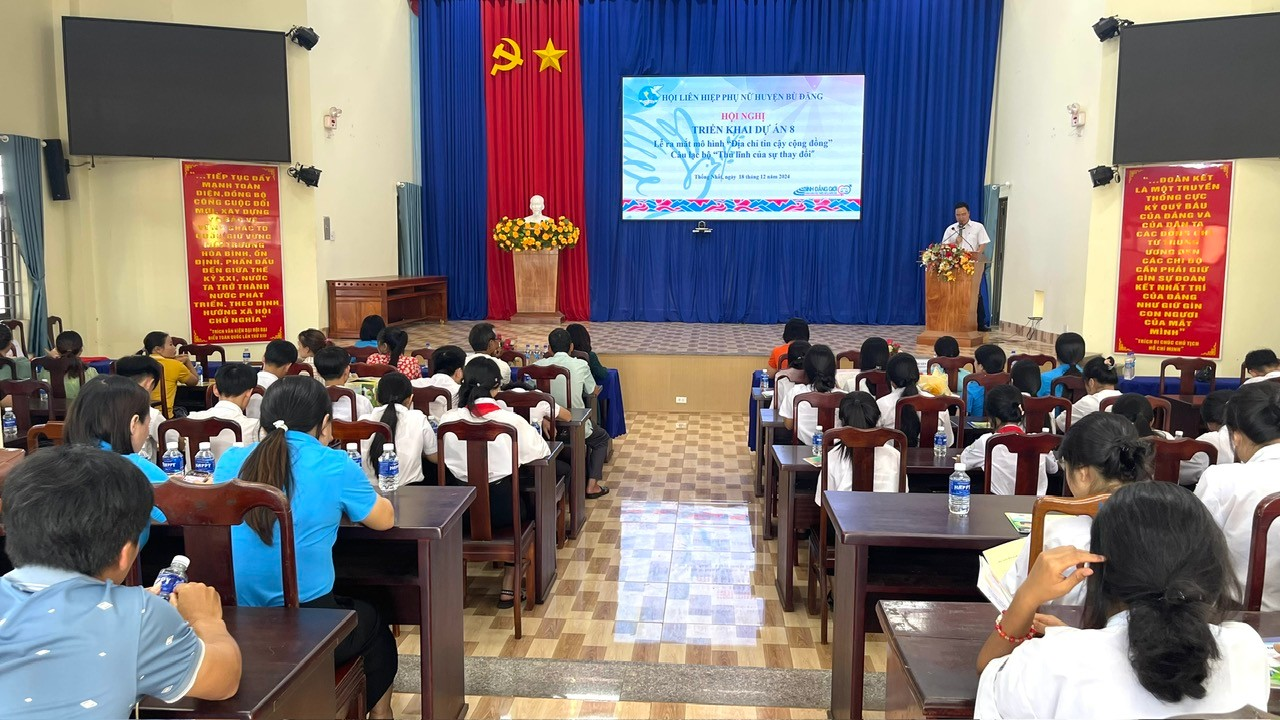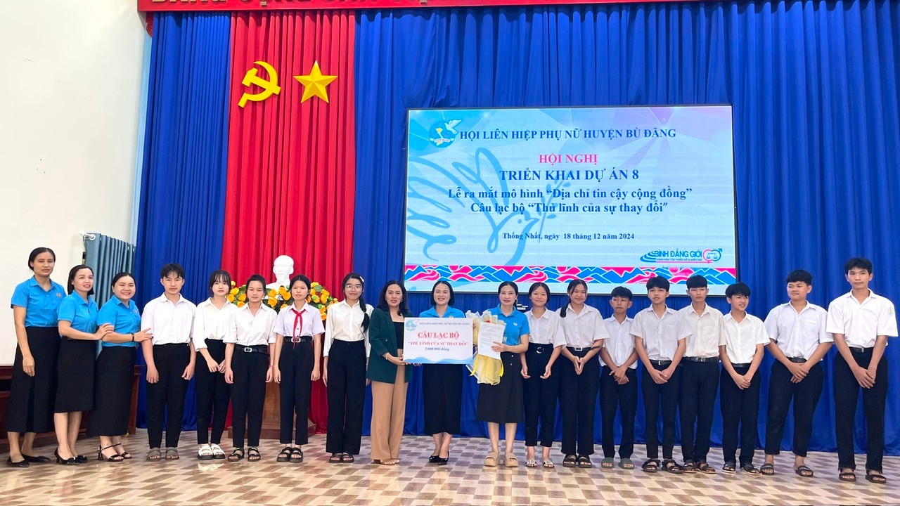 Chiều 18-12, tại UBND xã Thống Nhất, Hội LHPN huyện Bù Đăng phối hợp Hội LHPN tỉnh Bình Phước tổ chức ra mắt mô hình “Địa chỉ tin cậy cộng đồng” và Câu lạc bộ “Thủ lĩnh của sự thay đổi". dự lễ có bà Lường Thị Xuyến – Phó Ban Tuyên giáo chính sách Hội LHPN tỉnh; Bà Bùi Thị Thuý Kiều – CT. Hội LHPN huyện; Lãnh đạo UBND xã; lãnh đạo Trường THPT Thống Nhất.