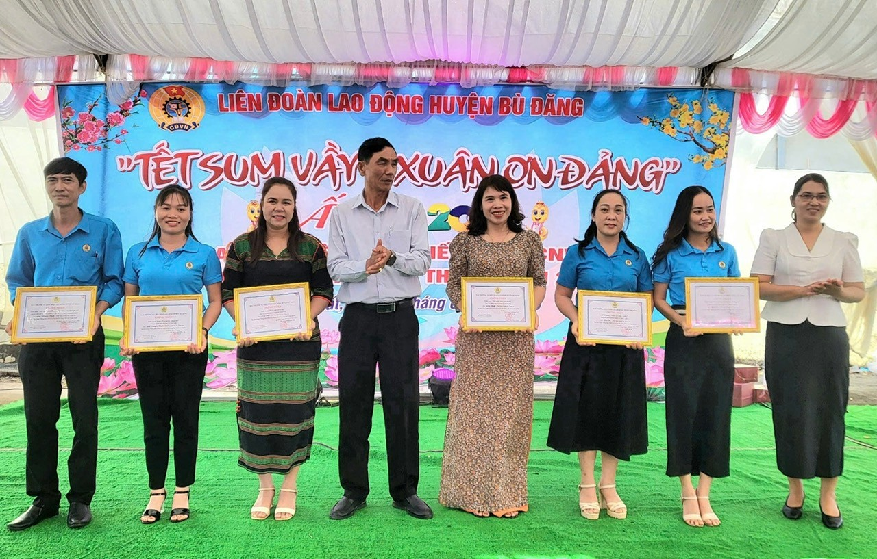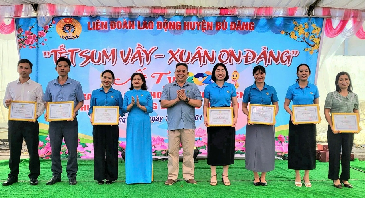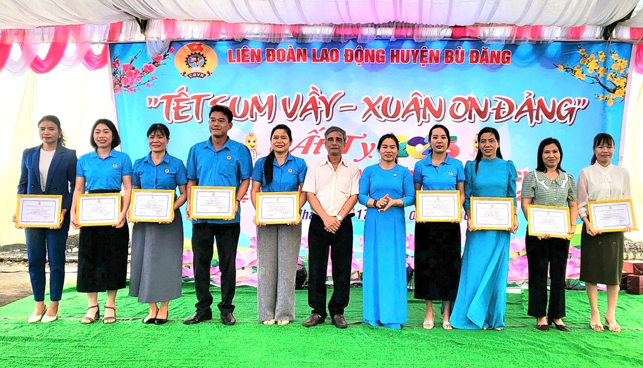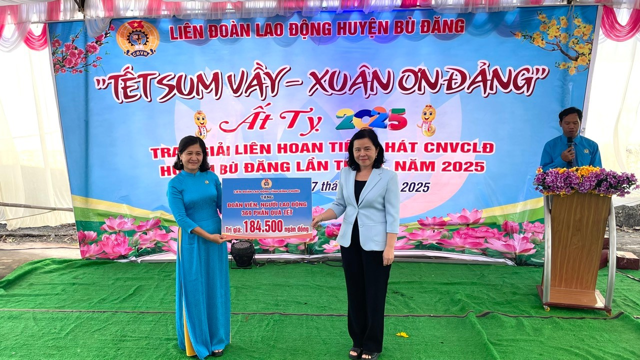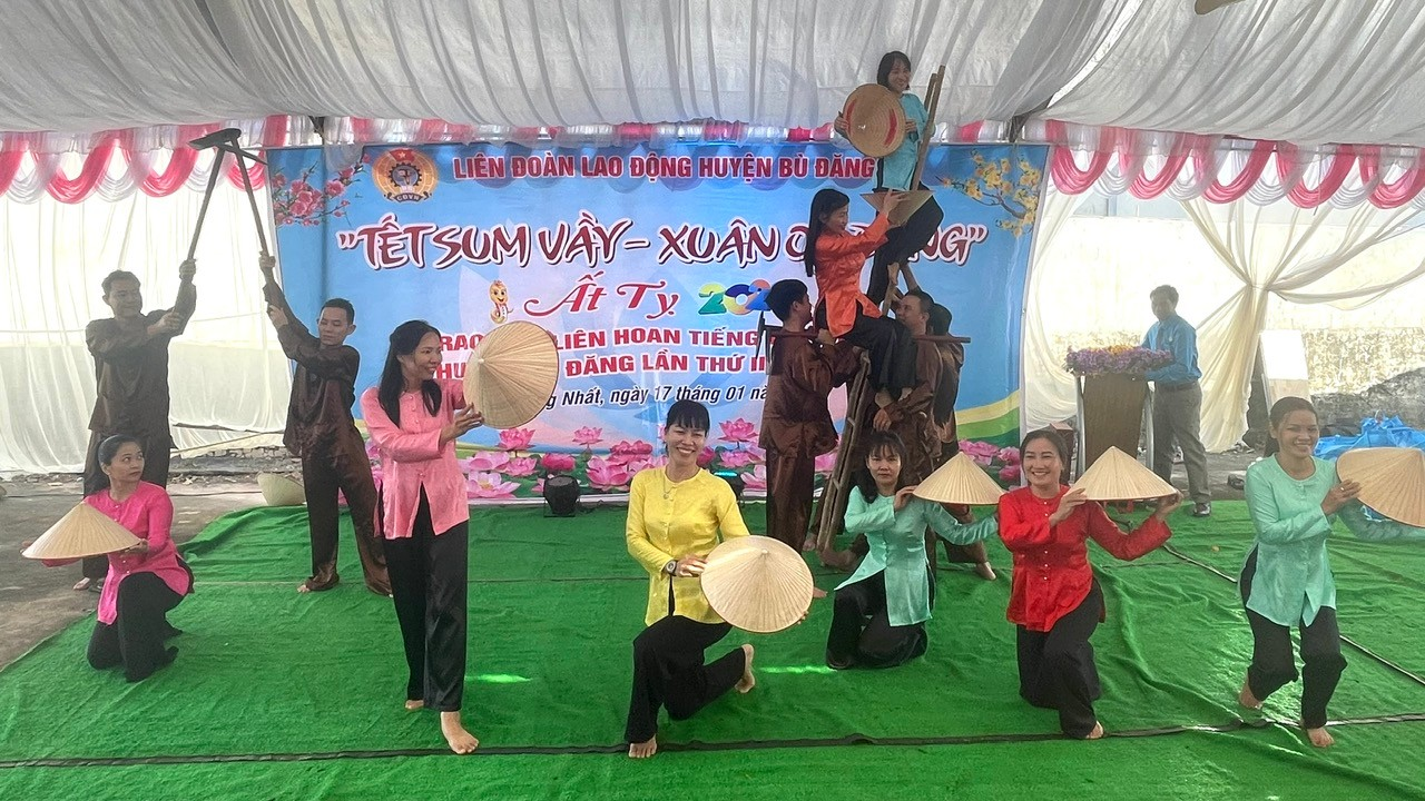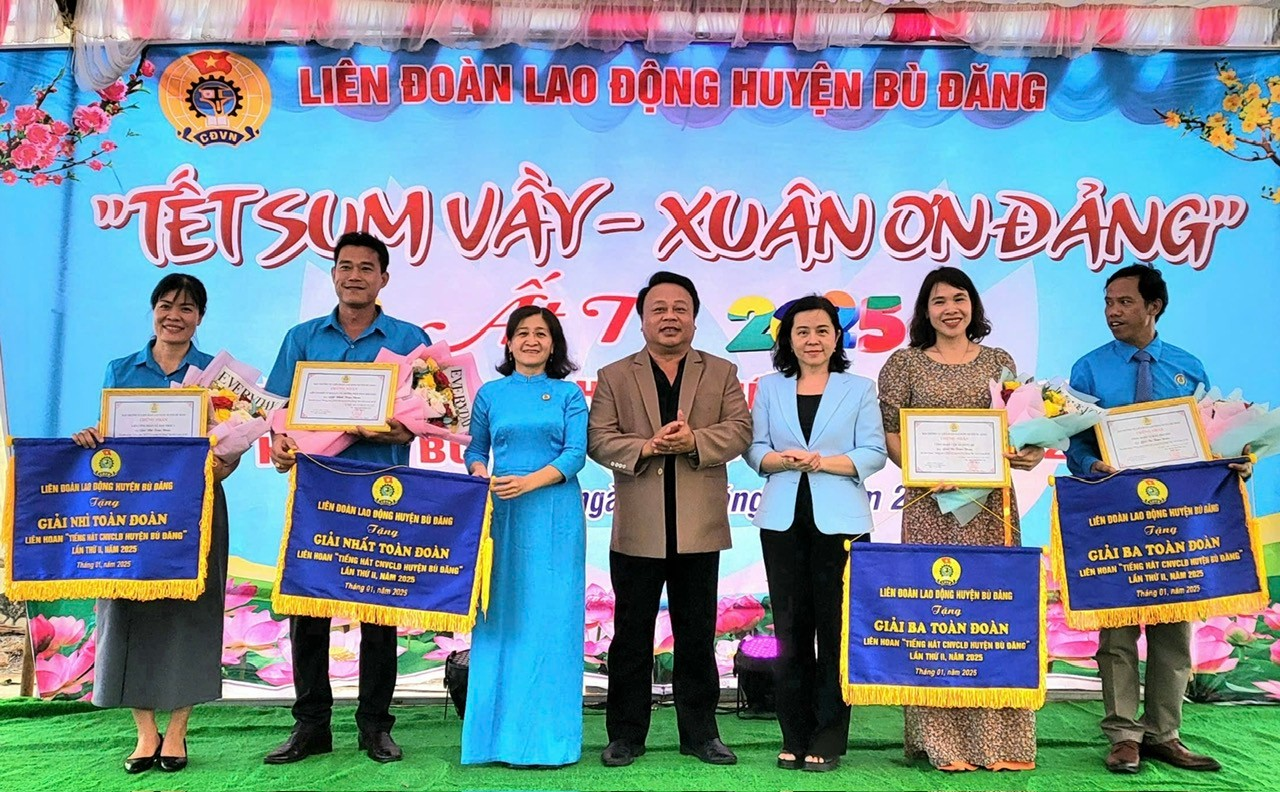 Sáng 17-01, Liên đoàn Lao động huyện Bù Đăng tổ chức chương trình “Tết Sum vầy – Xuân ơn Đảng” Ất Tỵ 2025 và công diễn, trao giải Liên hoan tiếng hát công nhân, viên chức, lao động (CNVCLĐ) lần thứ II năm 2025. Dự lễ có bà Nguyễn Thị Hương Giang – Uỷ viên Ban chấp hành Tổng liên đoàn Lao động Việt Nam, TUV, CT. LĐLĐ tỉnh; bà Lương thị Mỹ Duyên – HUV, CT.LĐLĐ huyện; cùng dự lễ có đại diện lãnh đạo Ban Dân vận, Ban Tuyên giáo Huyện uỷ, lãnh đạo các phòng, cơ quan chuyên môn huyện, đại diện Ban chấp hành các công đoàn cơ sở.