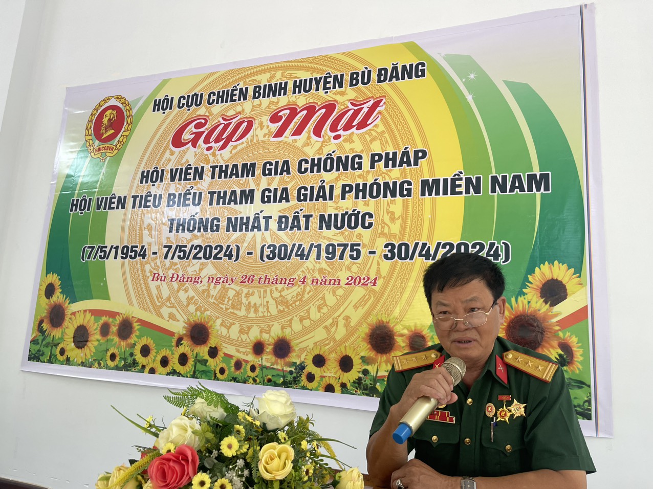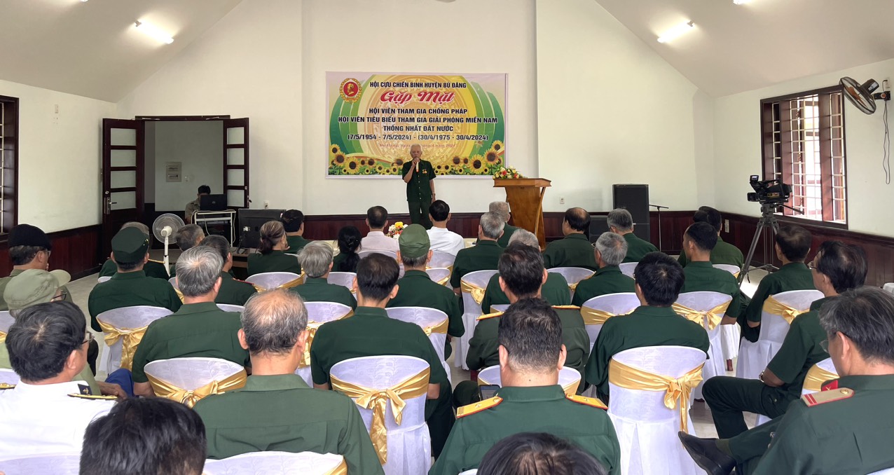 Tham dự buổi gặp mặt có hơn 30 đồng chí cựu chiến binh tham gia chống Pháp và chống Mỹ đang sinh sống và làm việc trên địa bàn huyện. Trong không khí trang trọng, ấm áp, tại buổi gặp mặt, thay mặt Ban Chấp hành Hội CCB huyện, Chủ tịch Hội CCB huyện đồng chí Lê Xuân Hải đã ôn lại lịch sử 49 năm Đại thắng Mùa xuân năm 1975, giải phóng miền Nam, thống nhất đất nước (30/4/1975 - 30/4/2024) và 70 năm Ngày Chiến thắng Điện Biên Phủ (7/5/1954 - 7/5/2024). Đây đều là những mốc son chói lọi, trang sử hào hùng trong lịch sử dựng nước, giữ nước của dân tộc. Đồng thời, các đại biểu bày tỏ lòng tri ân sâu sắc đối với những thế hệ cha anh đã chiến đấu anh dũng, hy sinh vì độc lập, tự do của Tổ quốc.
