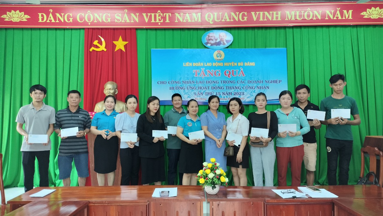 Phát biểu tại buổi tặng quà Chủ tịch Liên đoàn lao động huyện Lương Thị Mỹ Duyên khẳng định: Chăm lo đời sống vật chất, tinh thần cho đoàn viên, công nhân lao động là hoạt động thường xuyên và là một trong những nét đặc trưng của tổ chức công đoàn nhằm chia sẻ, động viên đoàn viên, công nhân lao động vượt qua khó khăn trước mắt, hăng say thi đua lao động, sản xuất, góp phần thực hiện thắng lợi nghị quyết đại hội công đoàn các cấp. Đồng thời mong muốn: Công nhân lao động cũng xem tổ chức công đoàn là nơi gắn kết, là “cầu nối” giữa CNLĐ và doanh nghiệp trong việc đảm bảo các chính sách phúc lợi, giúp CNLĐ tăng thu nhập, trợ cấp hoàn cảnh khó khăn từ đó an tâm công tác và ngày càng tin tưởng vào tổ chức công đoàn.