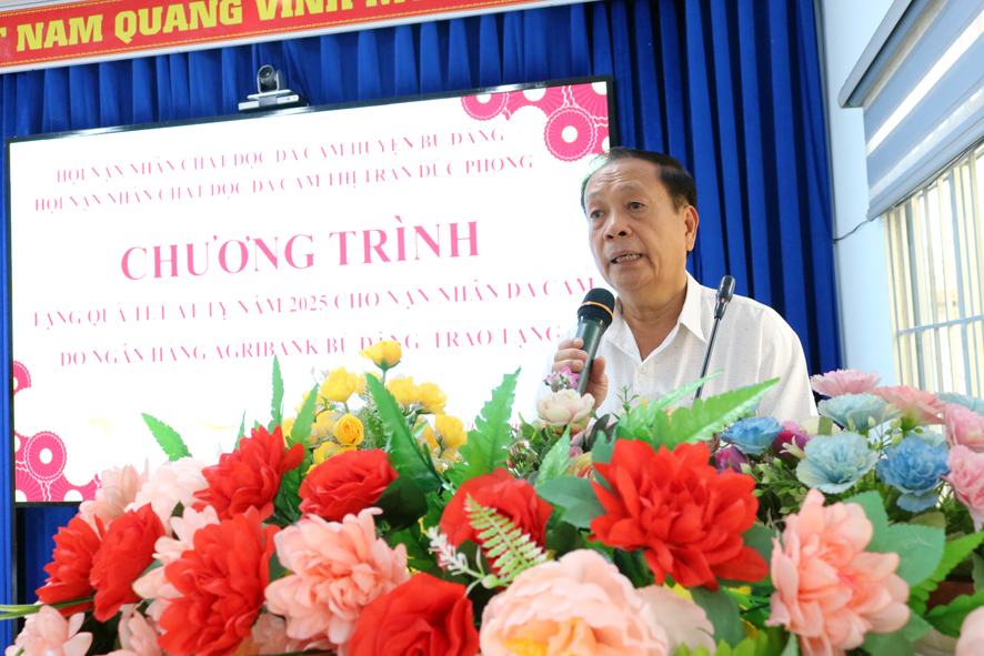 Ông Lương Hận chủ tịch Hội nạn nhân chất độc Da cam huyện Bù Đăng phát biểu chúc mừng năm mới tới các nạn nhân và cảm ơn lãnh đạo Agribank chi nhánh Bù Đăng