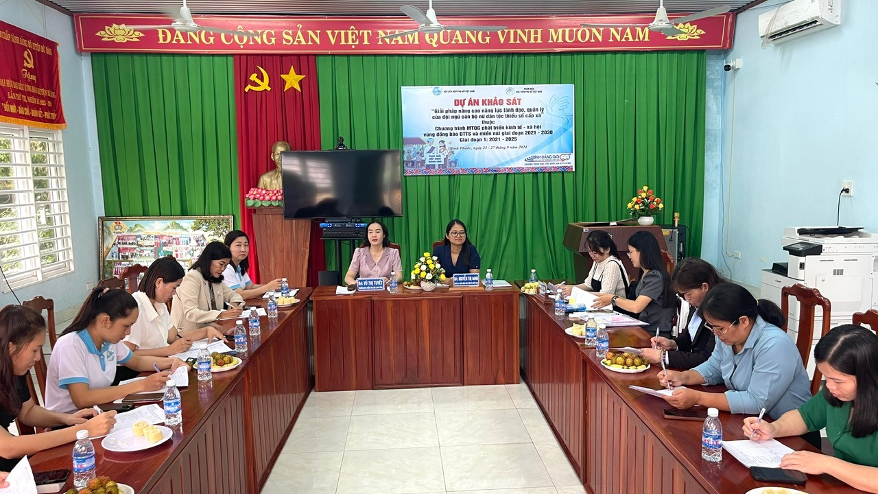 Với đối tượng tổ chức khảo sát là cán bộ lãnh đạo cấp huyện; cán bộ lãnh đạo là người đồng bào dân tộc thiểu số các xã, thị trấn; cán bộ, công chức cấp xã. Hoạt động khảo sát gồm: khảo sát bằng phiếu hỏi và phỏng vấn trực tiếp. Tại buổi khảo sát các đại biểu đã trực tiếp trả lời 59 câu hỏi trắc nghiệm về thực trạng năng lực lãnh đạo, quản lý; 32 câu hỏi trắc nghiệm các yếu tố ảnh hưởng đến năng lực lãnh đạo quản lý của cán bộ nữ dân tộc thiểu số cấp xã; 35 câu hỏi trắc nghiệm về nhu cầu bồi dưỡng nâng cao năng lực lãnh đạo, quản lý của đội ngũ cán bộ nữ dân tộc thiểu số.