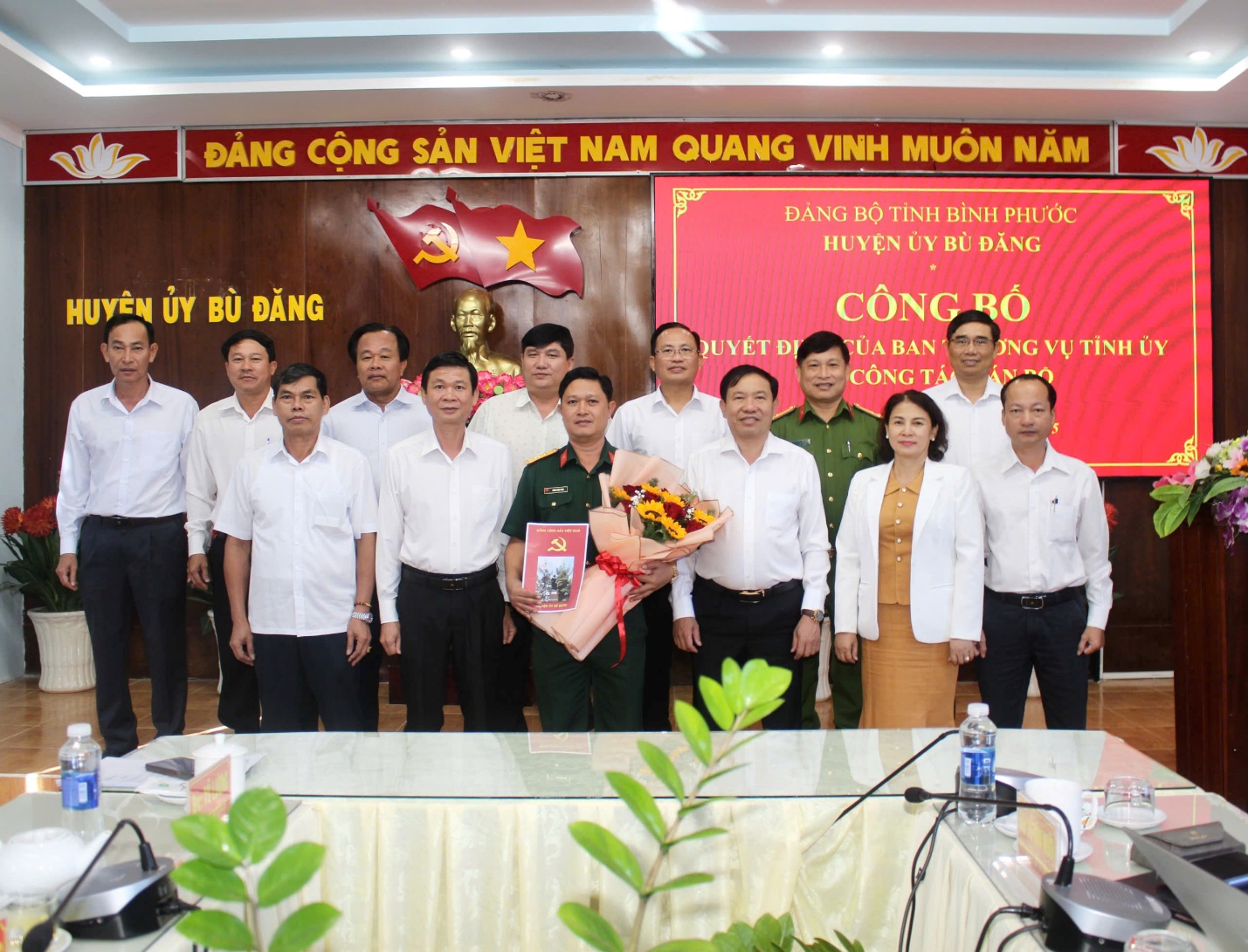Tỉnh ủy viên, Bí thư Huyện ủy Bù Đăng Vũ Lương, Phó Bí thư Thường trực Huyện ủy, Chủ tịch HĐND huyện Nguyễn Tấn Hồng, Phó Bí thư Huyện ủy, chủ tịch UBND huyện Vũ Văn Mười trao quyết định và hoa cho đồng chí Lương Công Trực.
