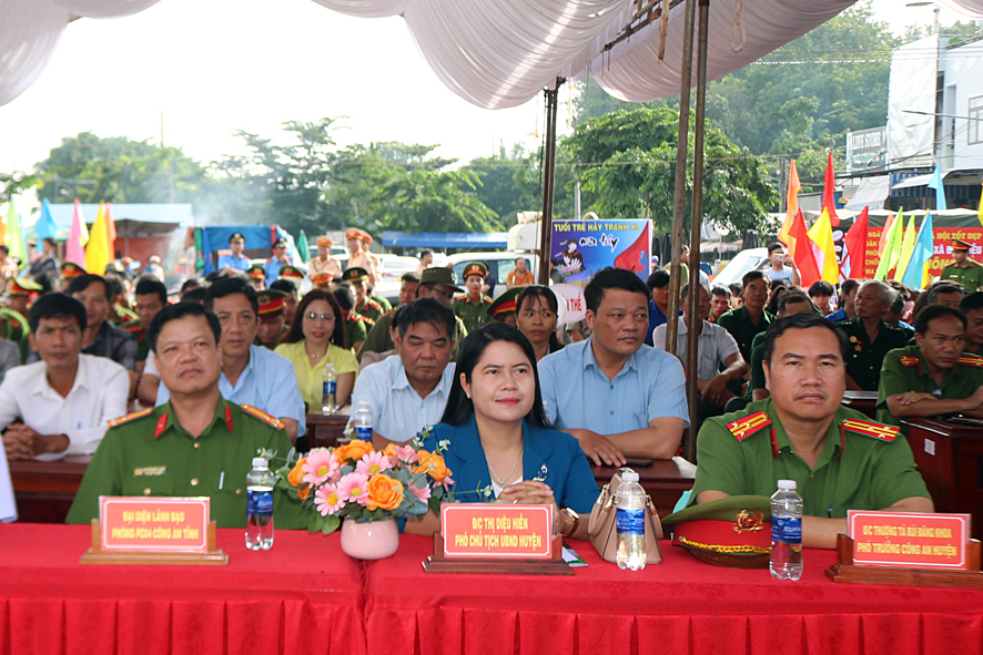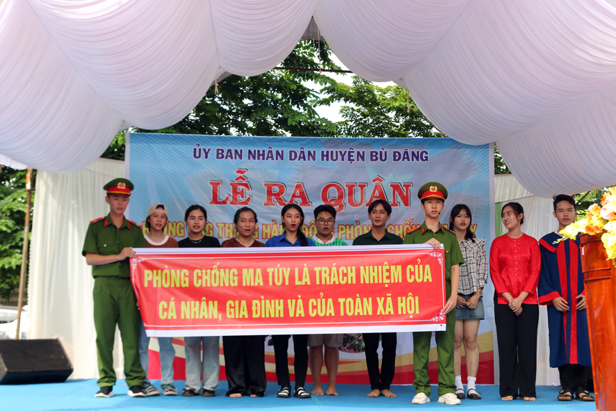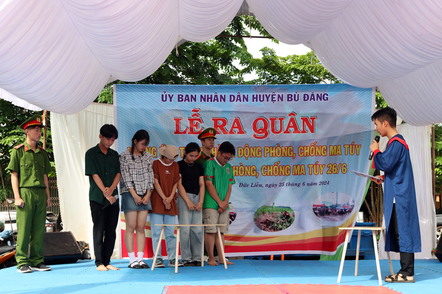 Tại buổi lễ, hơn 200 đại biểu, đoàn viên thanh niên, học sinh được nghe cán bộ Công an huyện thông tin về tình hình tội phạm, tệ nạn ma túy trên địa bàn huyện trong thời gian qua. Đồng thời, phát tờ rơi tuyên truyền về tác hại, cách nhận biết các loại ma túy, biện pháp phòng ngừa và các quy định của pháp luật về xử lý người vi phạm, tham gia tệ nạn và tội phạm ma túy; đặc biệt trong buổi lễ các em học sinh, đoàn viên thanh niên trường THPT Lê Qúy Đôn đã trình bày tiểu phẩm “Lời hối hận muộn màng” nhằm tuyên truyền về tình hình tội phạm và thực hiện các biện pháp, giáo dục, phòng ngừa tệ nạn ma túy trong lứa tuổi thanh, thiếu niên, học sinh.
