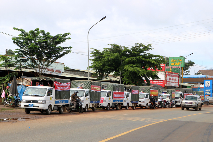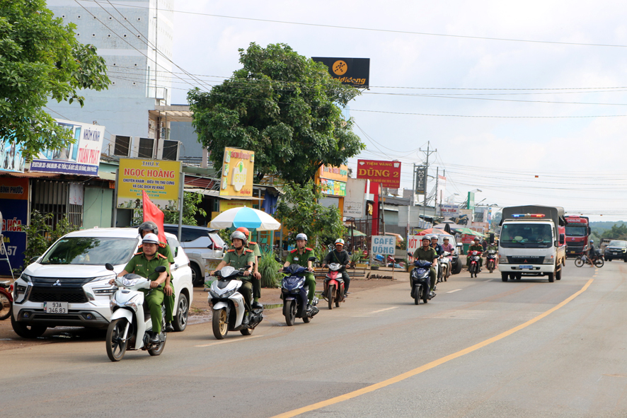 Lực lượng đoàn viên, thanh niên, công an và đoàn xe cổ động diễu hành tuyên truyền trên các tuyến đường trung tâm xã Đức Liễu và QL 14