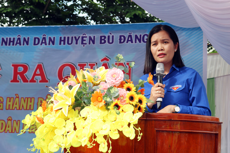 Đại diện tuổi trẻ huyện nhà, chị Đào Thị Quế Bí thư huyện đoàn phát biểu hưởng ứng lễ ra quân