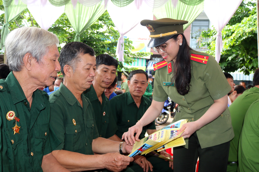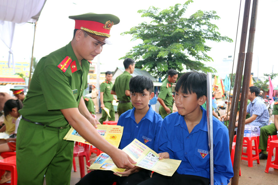 Đoàn viên Chi đoàn công an huyện Bù Đăng phát tờ rơi tuyên truyền về tác hại và các biện pháp phòng, chống ma túy