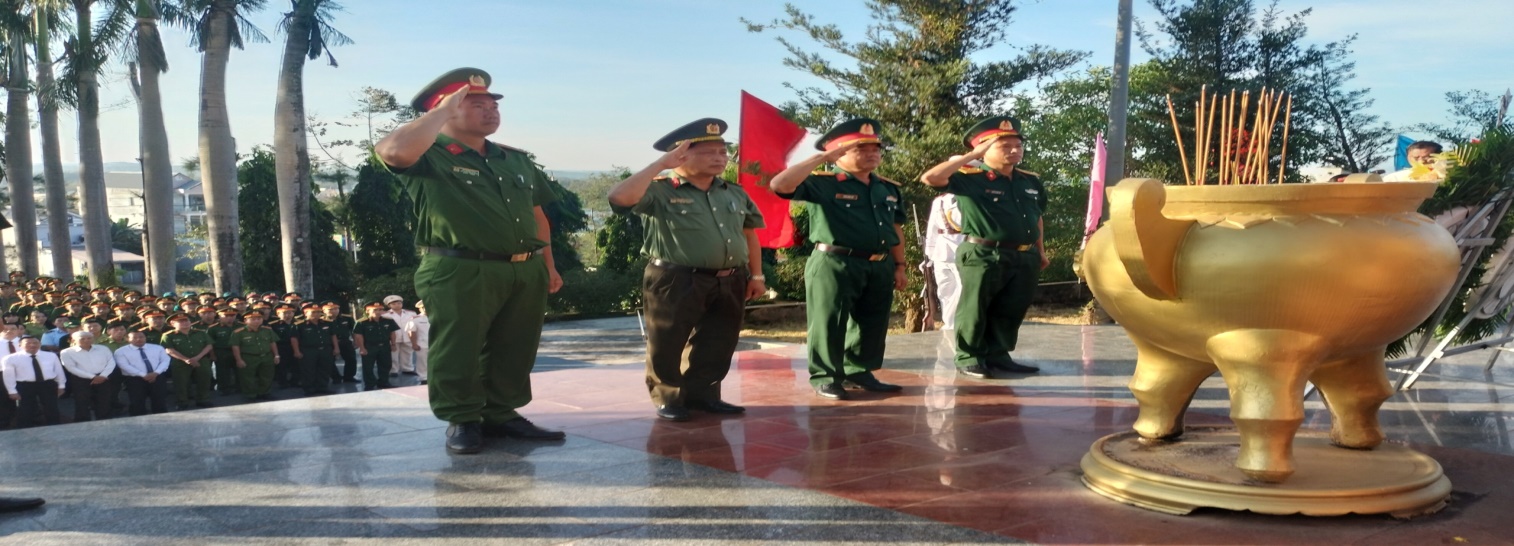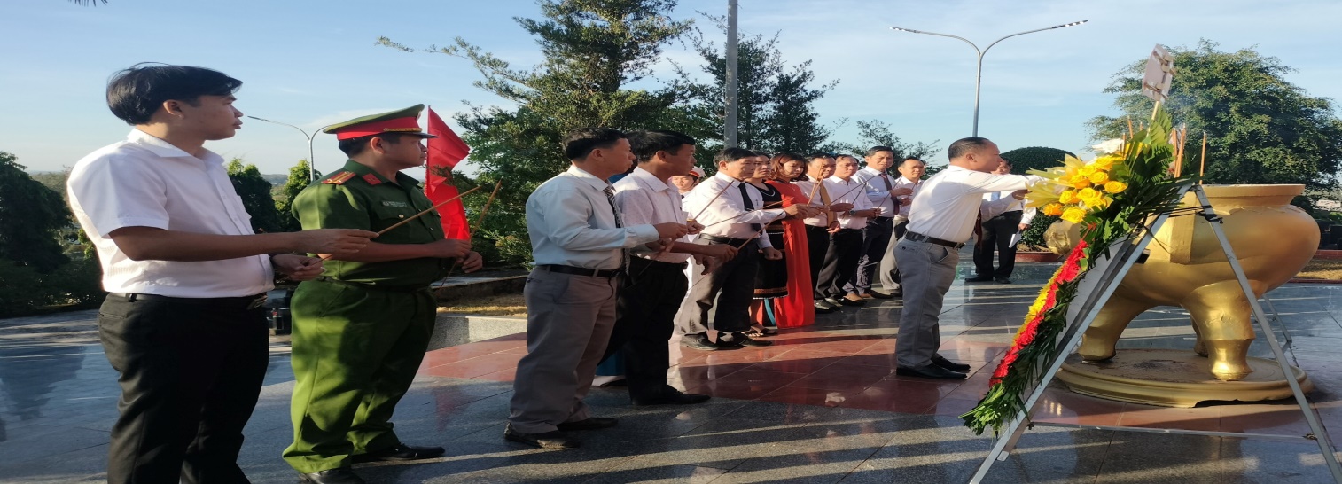 Đại biểu tham dự lễ viếng Lãnh đạo Huyện ủy, HĐND, UBND, UBMTTQVN huyện dâng hương, dâng hoa trước đài Nghĩa trang liệt sĩ huyện.
