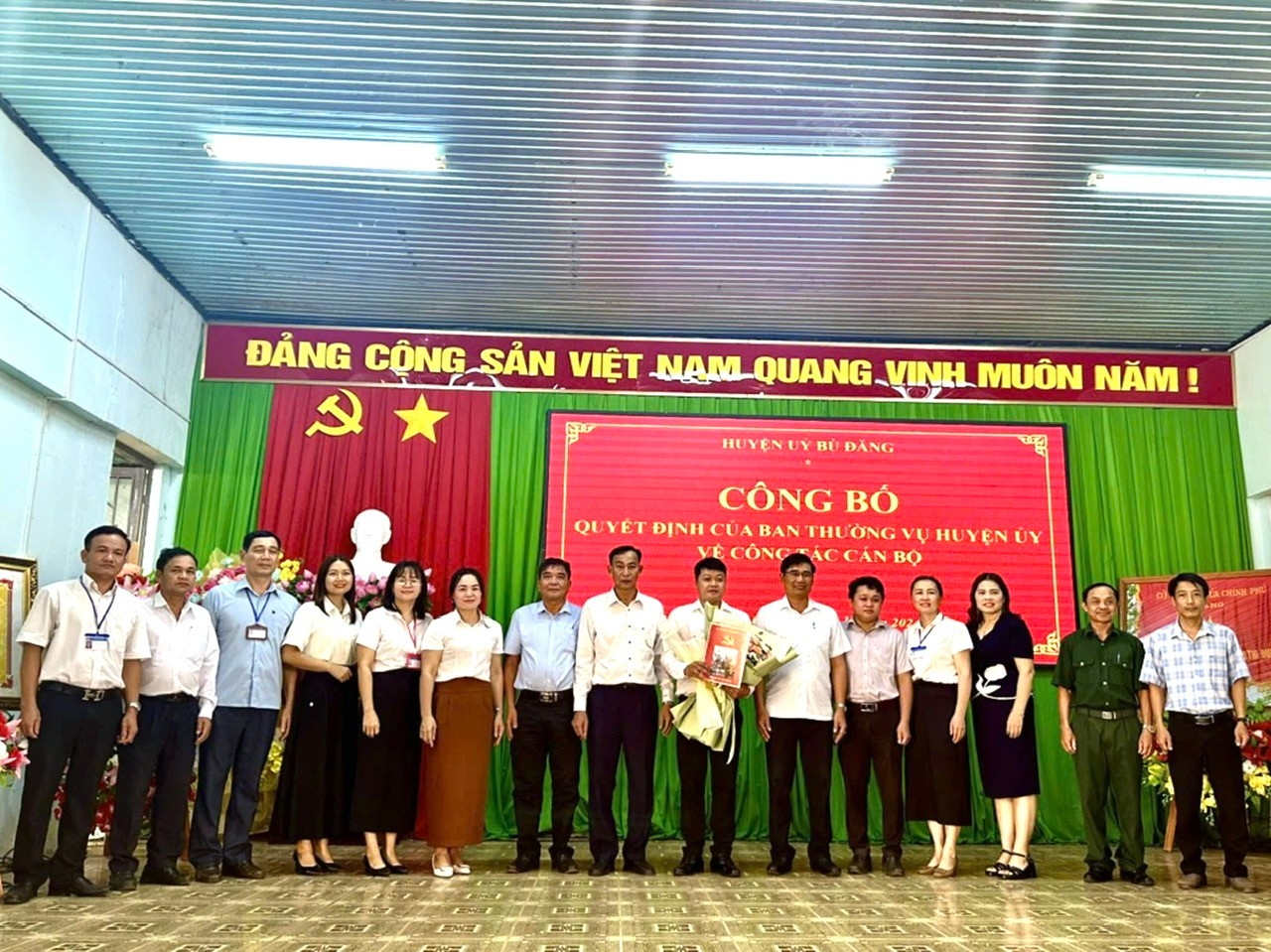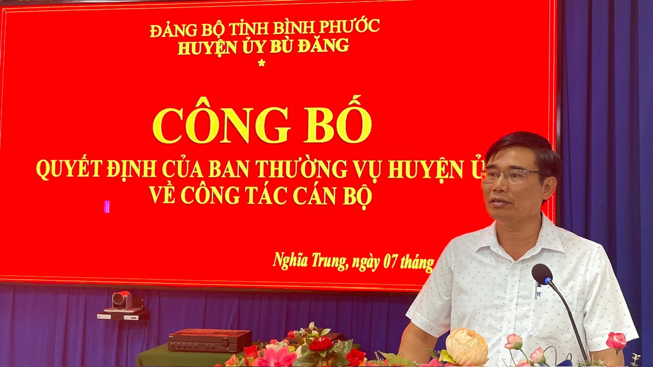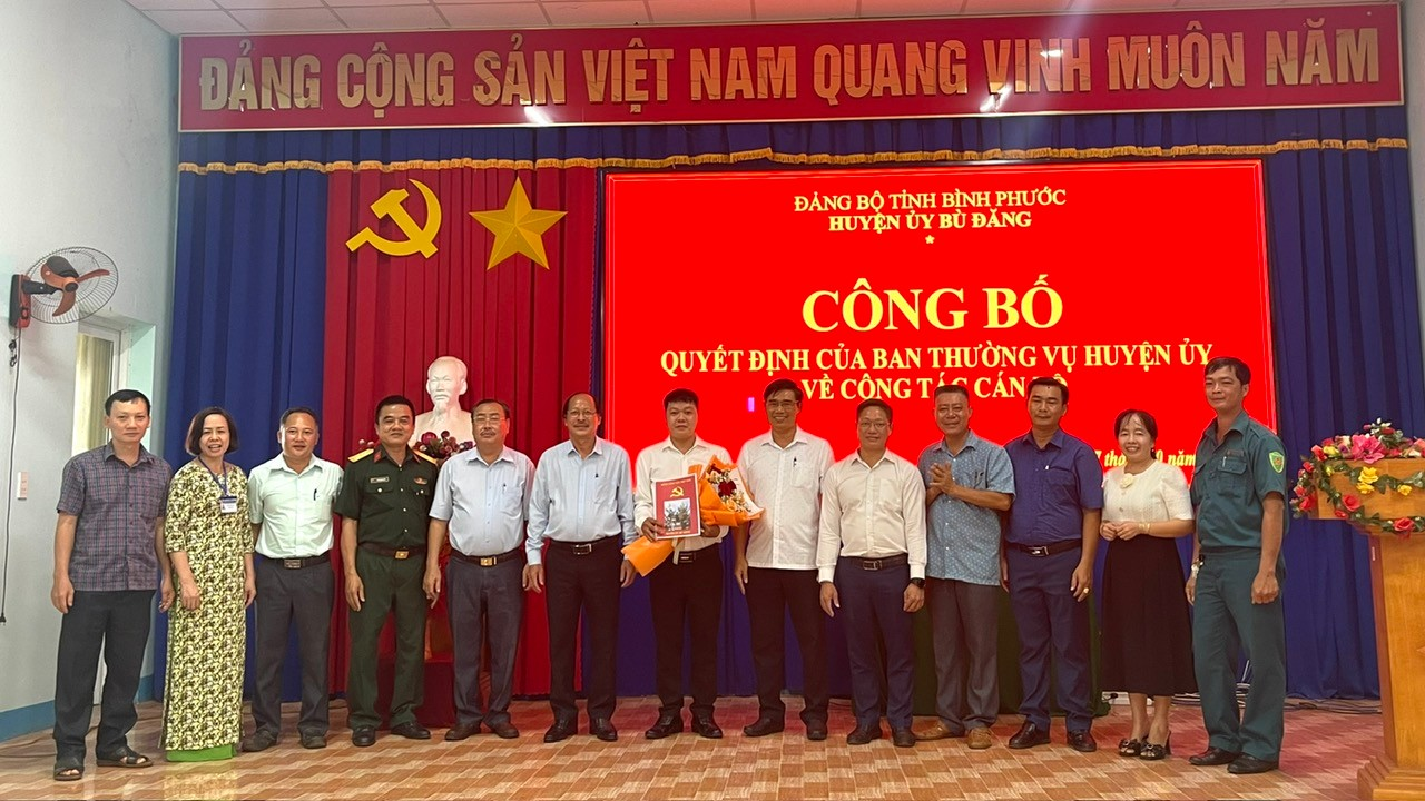 Tại hội nghị, đồng chí Bùi Ngọc Hân thay mặt Ban Chấp hành Đảng bộ huyện đã công bố Quyết định của Ban Thường vụ Huyện ủy Bù Đăng về việc điều động đồng chí Phan Minh Phương – Đảng uỷ viên, Chỉ huy trưởng Ban Chỉ huy quân sự xã Thọ Sơn, đến nhận nhiệm vụ tại UBND xã Nghĩa Trung; chỉ định tham gia Ban Chấp hành Đảng bộ xã Nghĩa Trung nhiệm kỳ 2020 - 2025, Quyết định có hiệu lực kể từ ngày 07/10/2024.