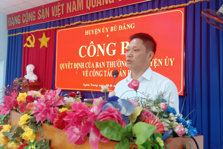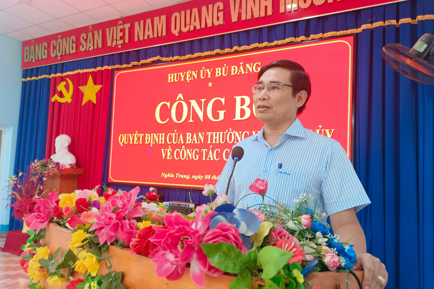 Phát biểu tại buổi công bố, đồng chí Bùi Ngọc Hân, Ủy viên Ban Thường vụ, Trưởng Ban tổ chức Huyện ủy, nhấn mạnh: Công tác bố trí, sắp xếp cán bộ là nhiệm quan trọng, việc làm thường xuyên của Đảng, nhằm tạo điều kiện để cán bộ được bồi dưỡng, rèn luyện, bổ sung kiến thức, kinh nghiệm, phát huy hết năng lực, sở trường, sẵn sàng nhận mọi nhiệm khi tổ chức phân công. Đồng thời đồng chí đánh giá cao quá trình tu dưỡng, rèn luyện, trưởng thành và những đóng góp, cống hiến của đồng chí Nguyễn Thành Vương trong thời gian vừa qua, tin tưởng rằng đồng chí Vương tiếp tục kế thừa, phát huy những thành quả, kinh nghiệm, phát huy tinh thần đoàn kết, khắc phục khó khăn đề ra những giải pháp, tập trung lãnh đạo, chỉ đạo, góp phần từng bước xây dựng xã Nghĩa Trung ngày càng phát triển xứng đáng với sự tin tưởng của Ban Thường vụ Huyện uỷ.