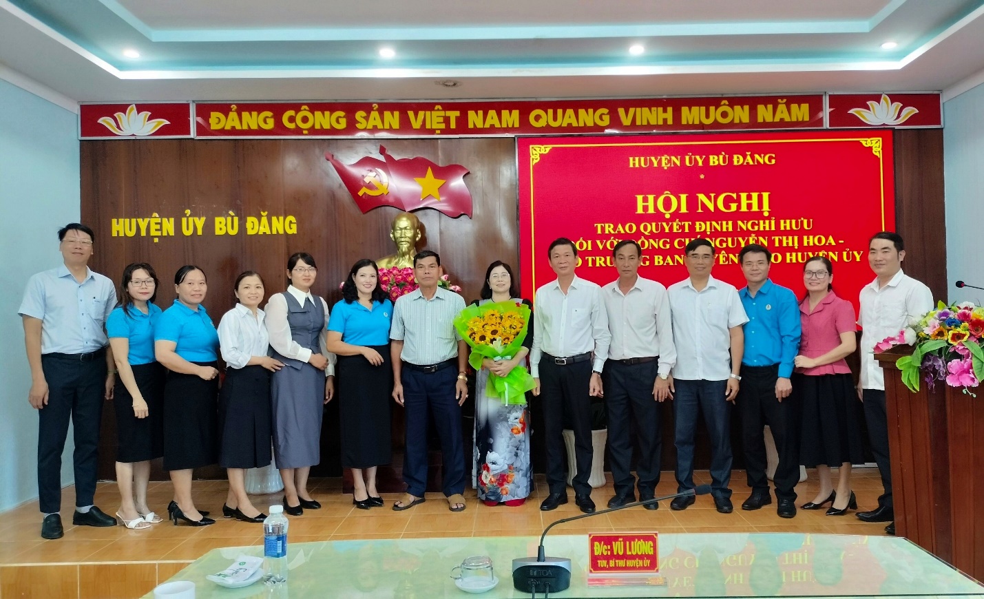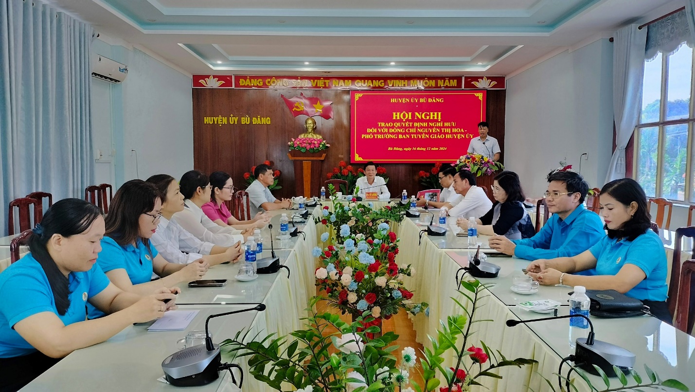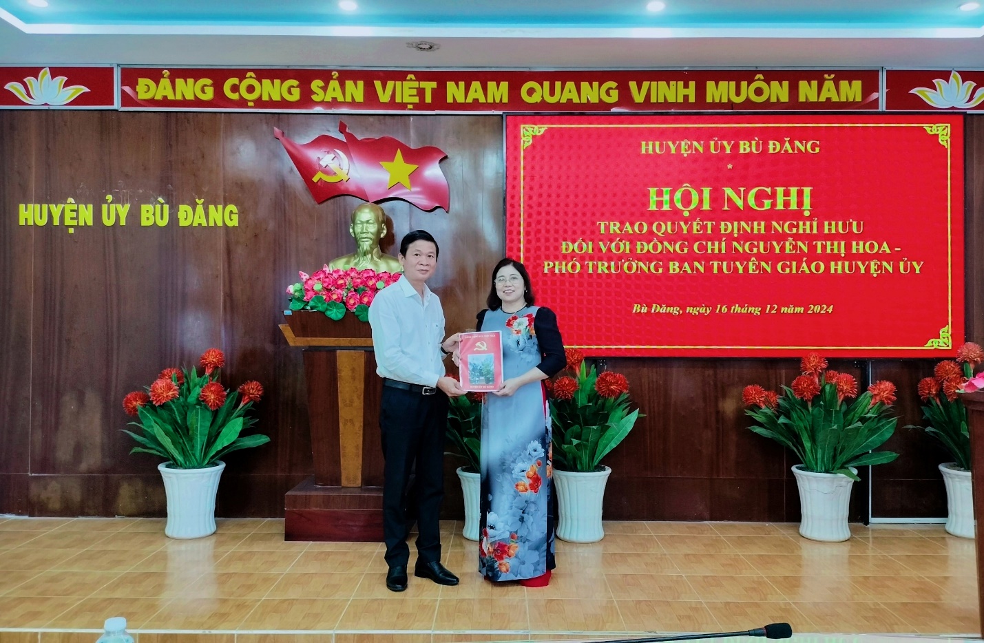 Chiều 17-12, đồng chí Vũ Lương, Tỉnh uỷ viên, Bí thư huyện uỷ, chủ trì trao quyết định nghỉ hưu theo chế độ cho đồng chí Nguyễn Thị Hoa, Phó Trưởng ban Tuyên giáo Huyện ủy Bù Đăng.