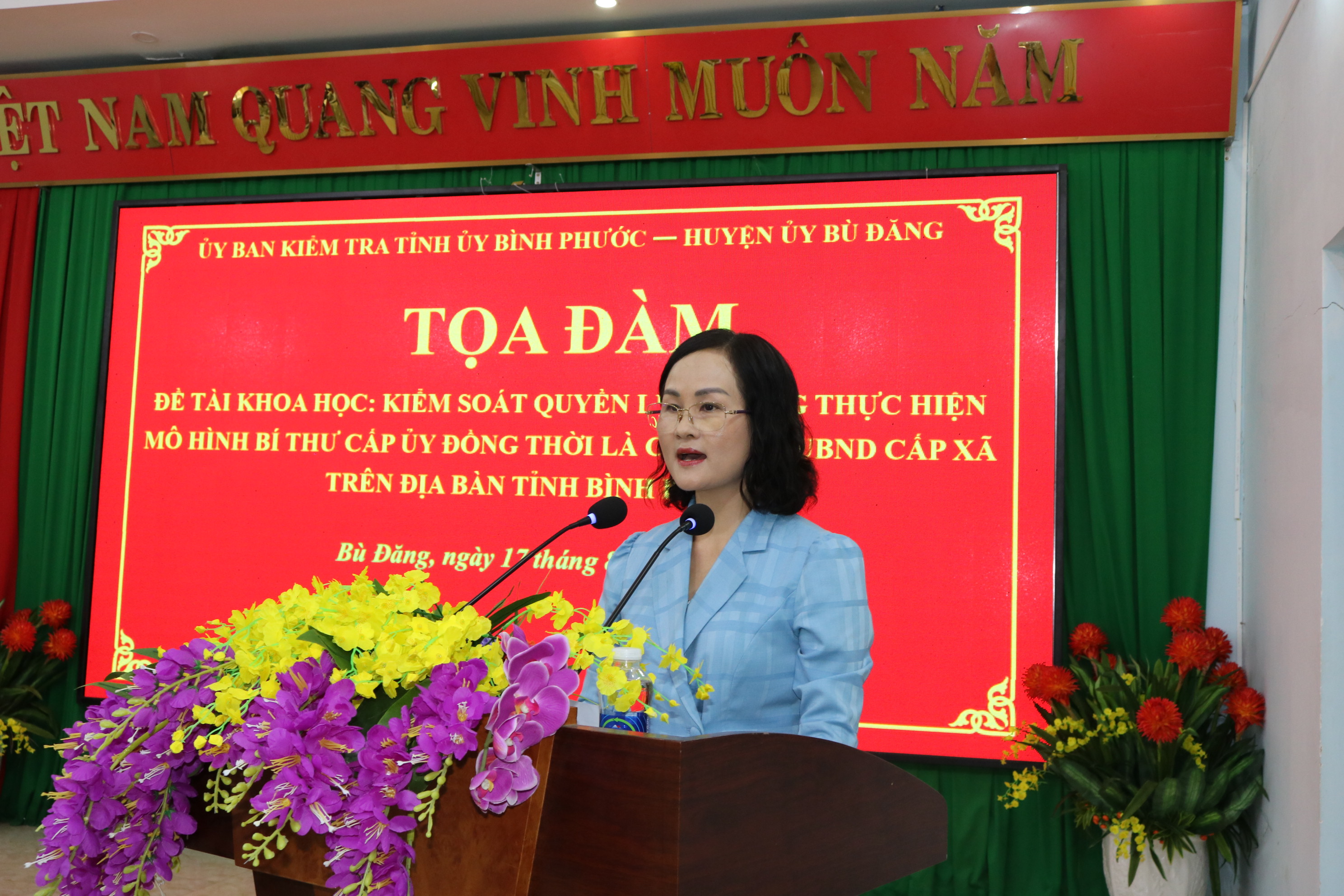 Tại buổi tọa đàm, các đại biểu đã được nghe đồng chí Giang Thị Phương Hạnh UVBTV tỉnh ủy, chủ nhiệm UBKT tỉnh ủy, Chủ nhiệm Đề tài, thông qua tóm tắt về nội dung Đề tài “Kiểm soát quyền lực trong thực hiện mô hình Bí thư cấp ủy đồng thời là Chủ tịch UBND cấp xã trên địa bàn tỉnh Bình Phước”