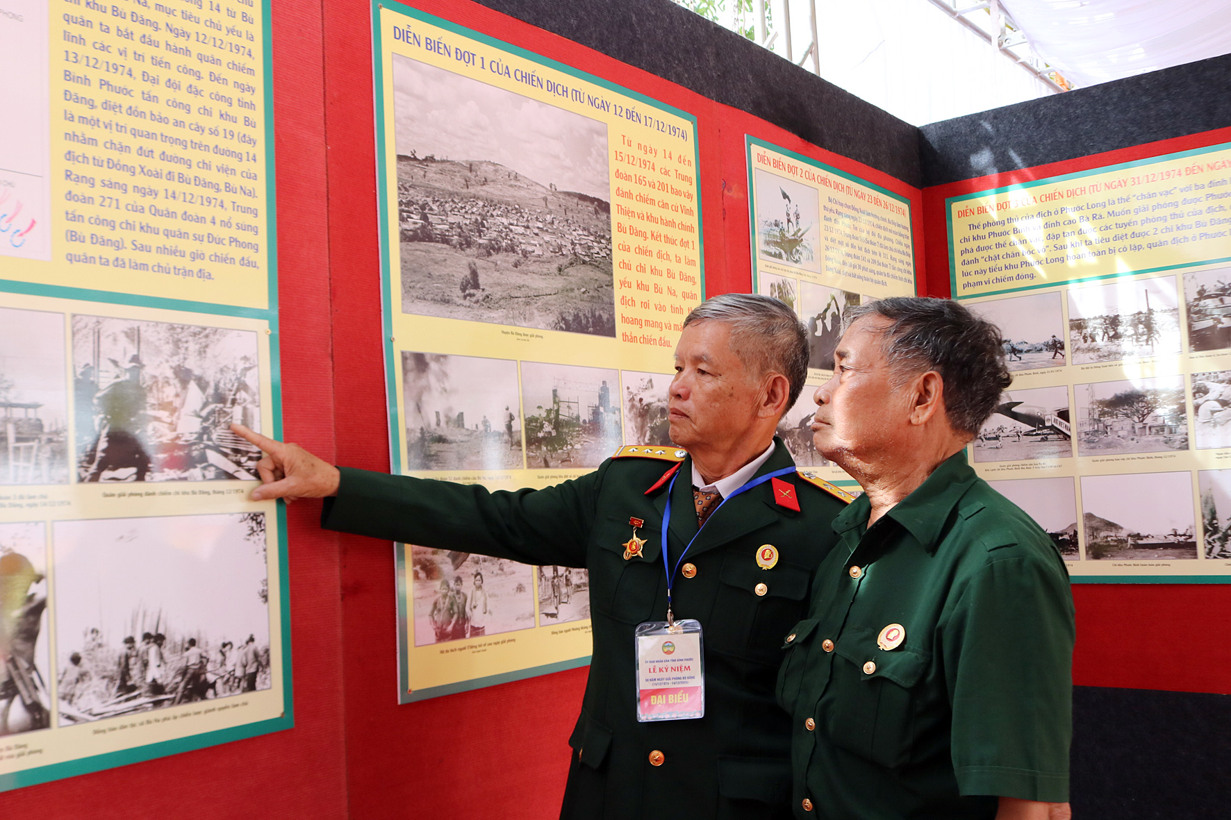Ông Nguyễn Như Nậm, thôn Sơn Thành, xã Phú Sơn cựu chiến binh tham gia chiến dịch Đường 14 – Phước Long trực tiếp tham gia trận đánh chi khu quân sự Đức Phong, giải phóng Bù Đăng cùng đồng đội xem lại những hình ảnh về trận đánh tại khu trưng bày các kỷ vật lễ kỉ niệm 50 năm giải phóng Bù Đăng