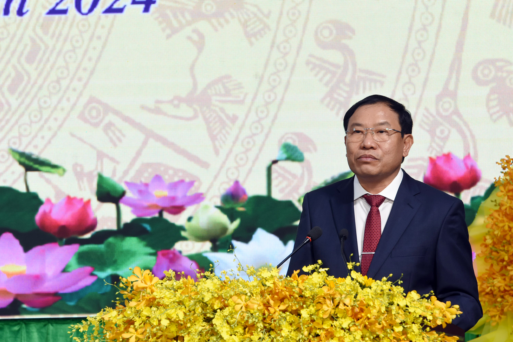 Ông Vũ Văn Mười, Phó bí thư, Chủ tịch UBND huyện Bù Đăng phát biểu nhận định về sự phát triển vươn mình của Bù Đăng sau 50 năm giải phóng tại lễ kỉ niệm