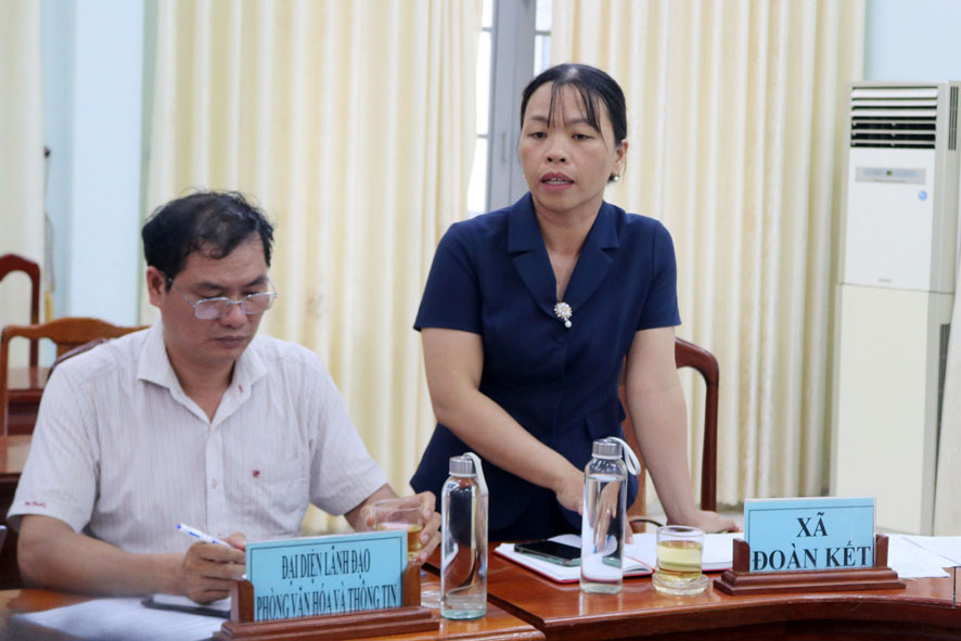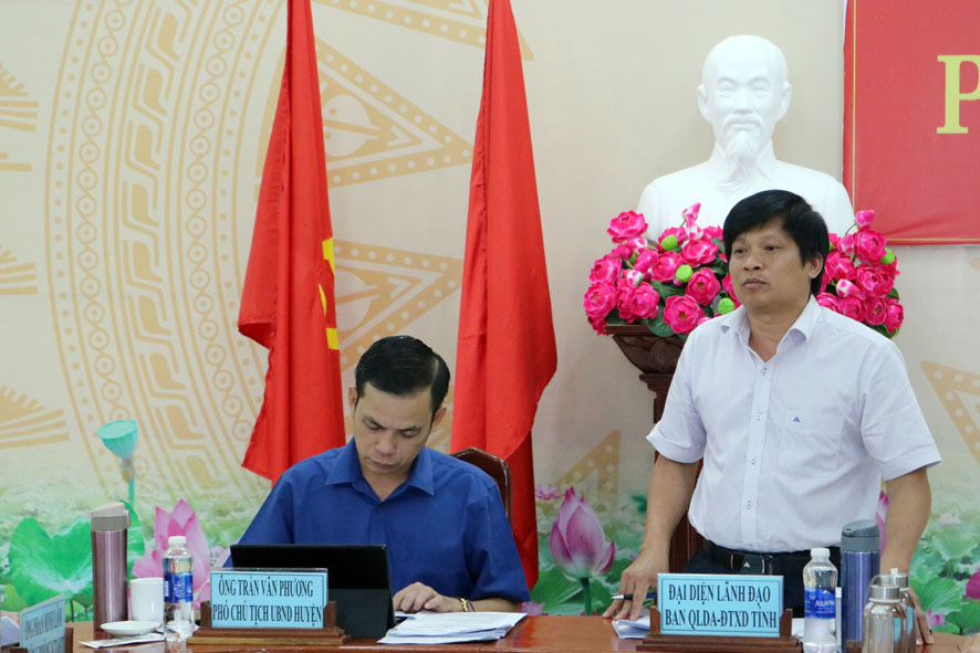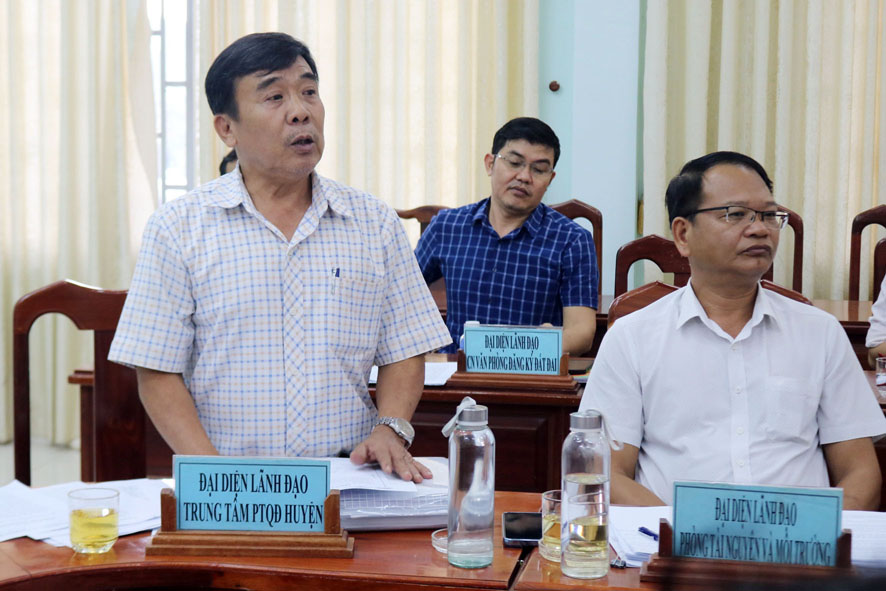 Đại diện Ban quản lý Dự án - Đầu tư xây dựng tỉnh Bình Phước, các phòng chuyên môn, đơn vị, UBND xã Đoàn Kết phát biểu thảo luận bàn các giải pháp tháo gỡ sớm tham mưu UBND huyện trên cơ sở đảm bảo đúng các quy định của pháp luật