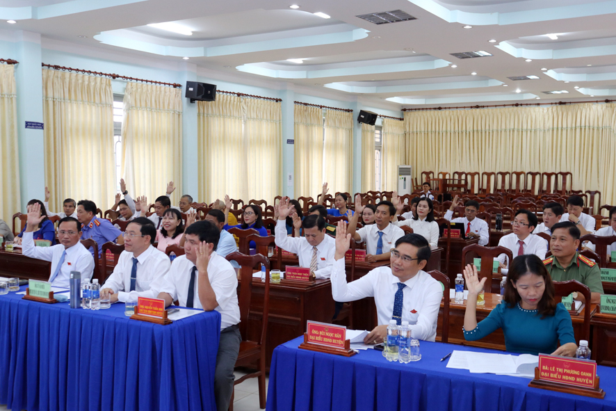 Các Đại biểu HĐND huyện biểu quyết thông qua Nghị quyết điều chỉnh vốn đầu tư công thại Kỳ họp thứ 11, nhiệm kỳ 2021 -2026