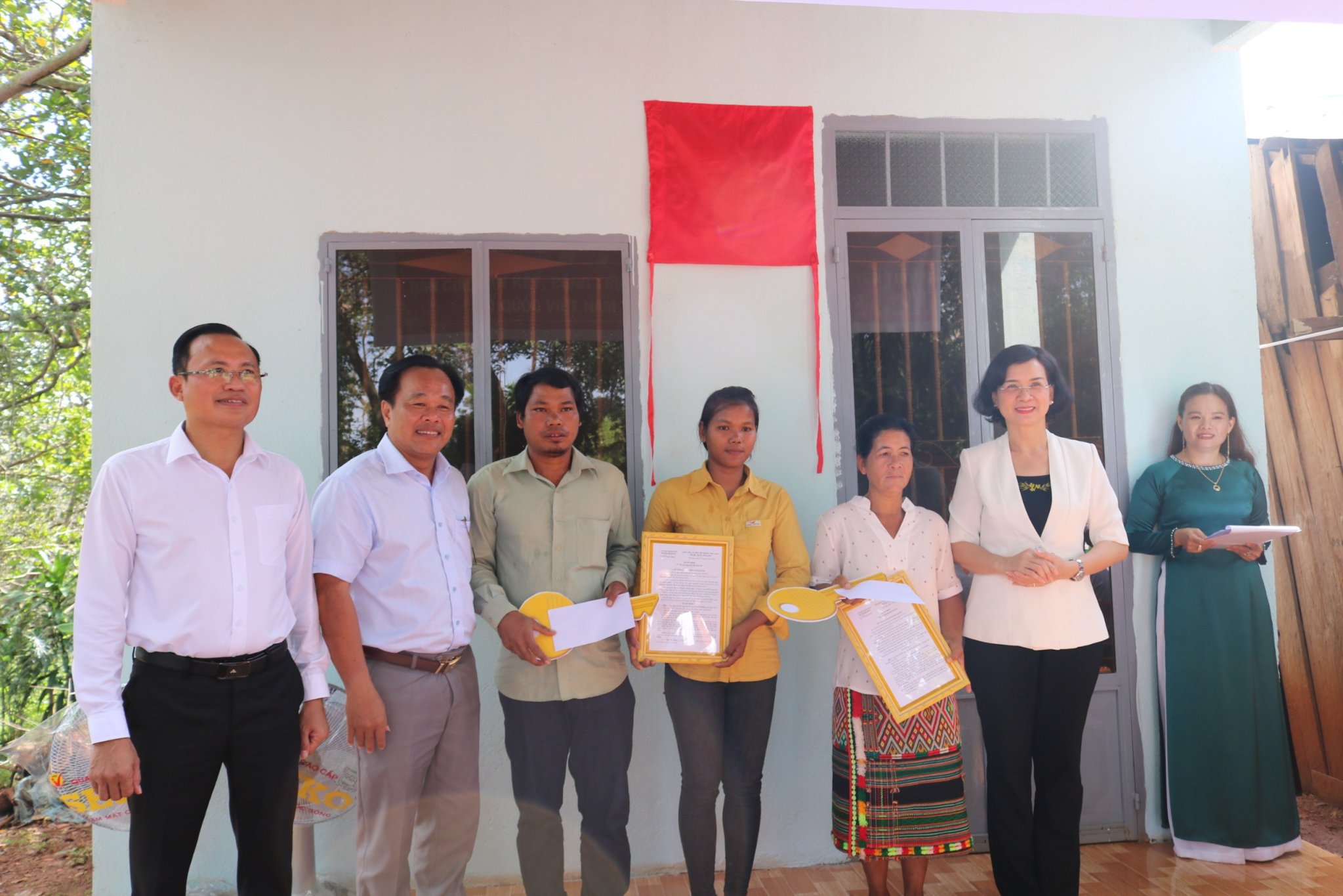 Uỷ viên Ban thường vụ, Phó chủ tịch UBND tỉnh Trần Tuyết Minh cùng lãnh đạo huyện Bù Đăng trao quyết định bàn giao nhà Đại đoàn kết cho hộ nghèo DTTS xã Đoàn Kết