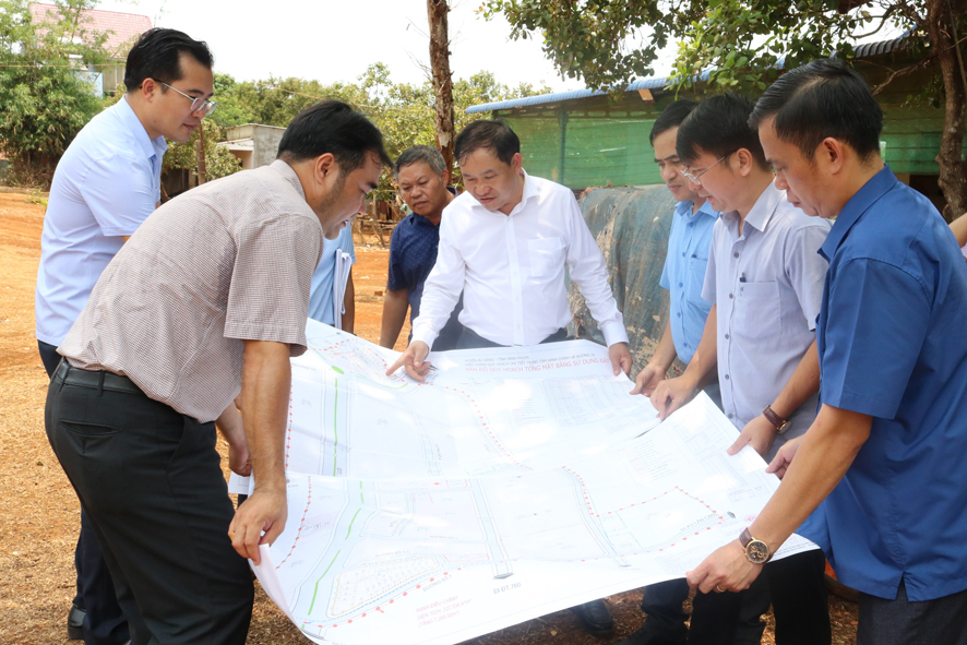 Phó Bí thư huyện uỷ, Chủ tịch UBND huyện Vũ Văn Mười cùng lãnh đạo các phòng chuyên môn khảo sát thực địa dự án trung tâm hành chính xã Đường 10